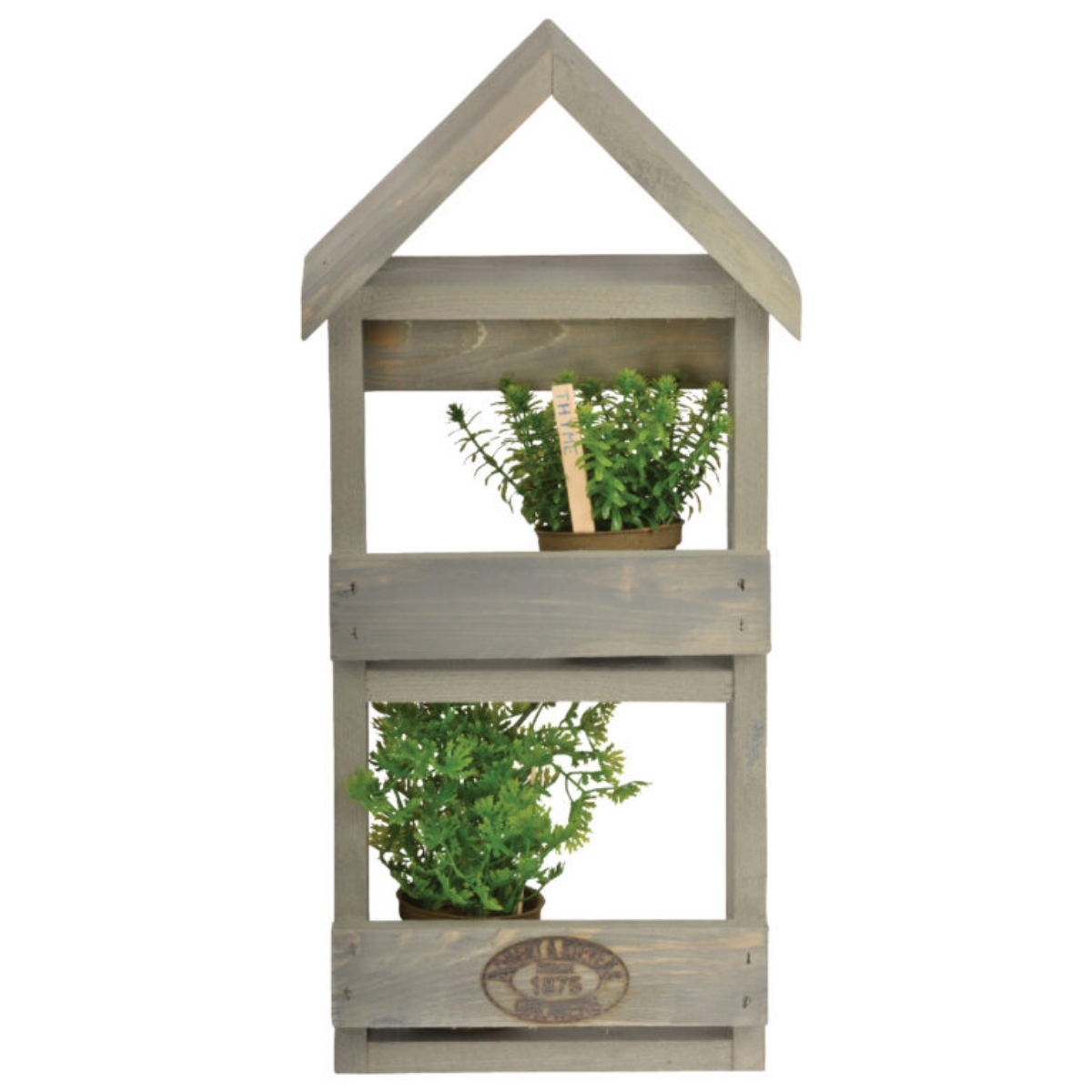 Polička na kvety v tvare domčeka s dvoma poschodiami v prírodnom farebnom prevedení s šedou patinou a vypáleným logom ROBERT and STEVENS, SINCE 1875, GROWERS.