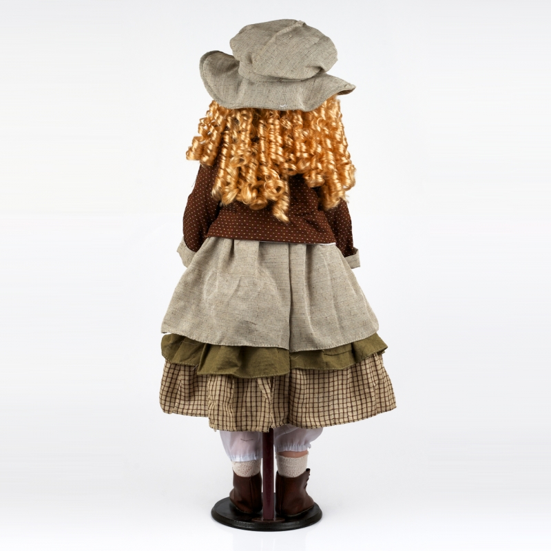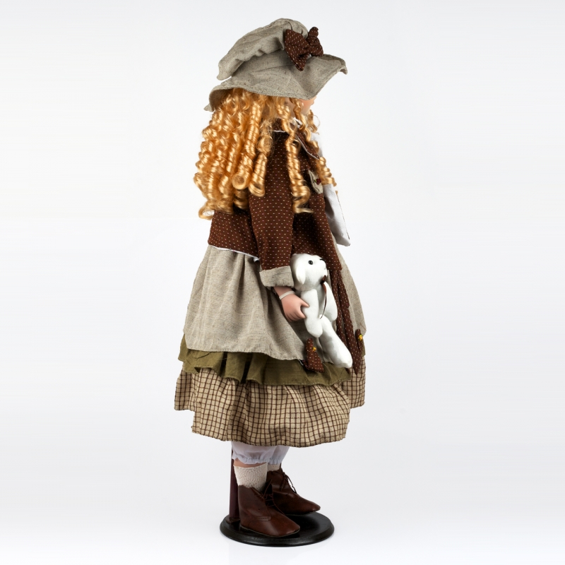 Panenka s kudrnatými vlásky. Šedé venkovské šatičky s kloboučkem ze stejného materiálu doplňuje hnědá kostkovaná sukýnka, sněhově bílé spodní kalhoty, ponožky a hnědé kožené botičky. v ruce panenka drží bílého medvídka.