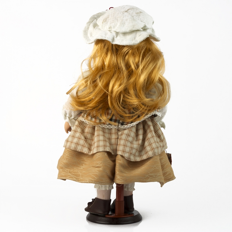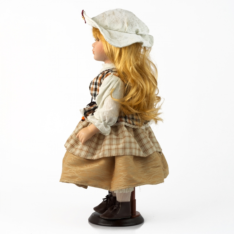 Porcelánová panenka má hnědé šatičky s károvanými doplňky, ozdobené korálky. Horní část zakrývá jarní vestička. Na hlavě má bílý klobouček, pod kterým vykukují přírodní blond vlásky.
