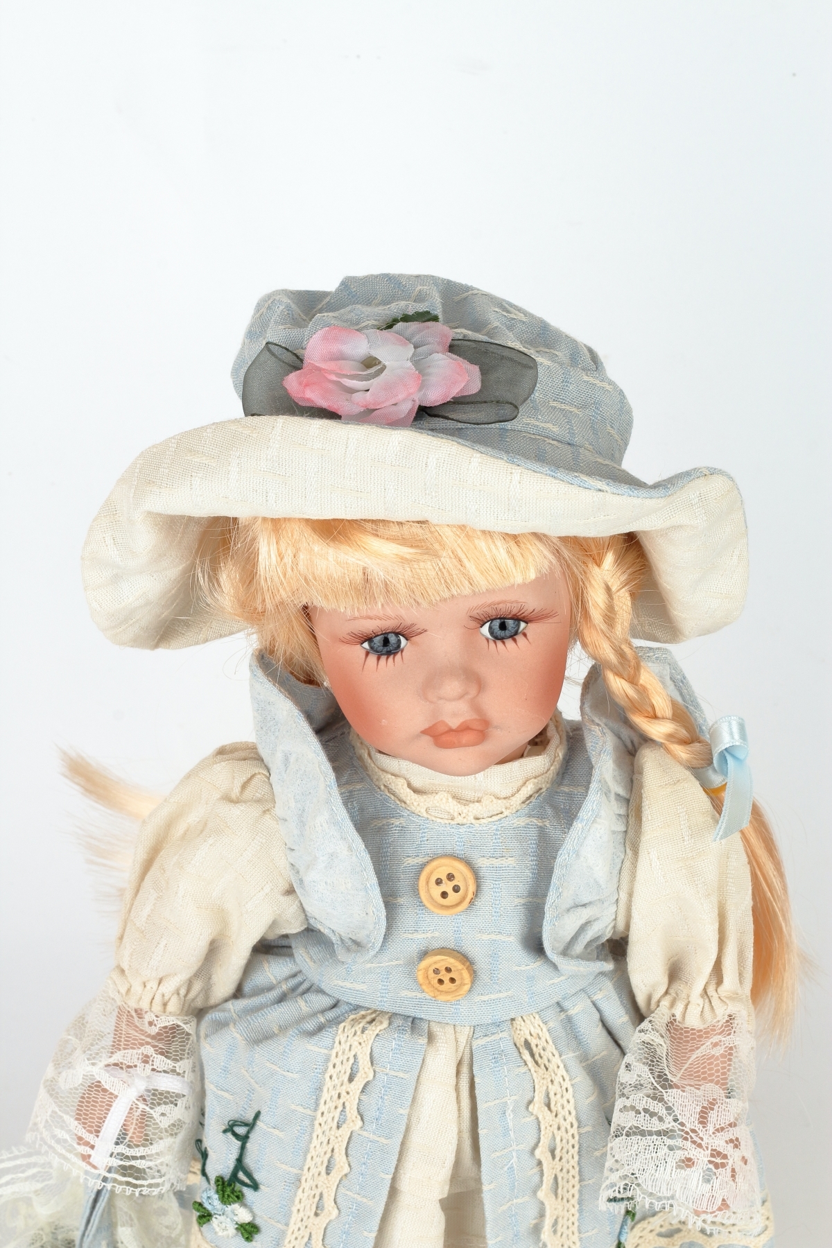 Bábika s porcelánovou hlavou je ručne maľovaná a oblečená v krásnych šatách a doplnkoch. Skvelý doplnok k interiéru, ktorý poteší vás, milé ženy, ktoré rady zdobíte svoj domov.