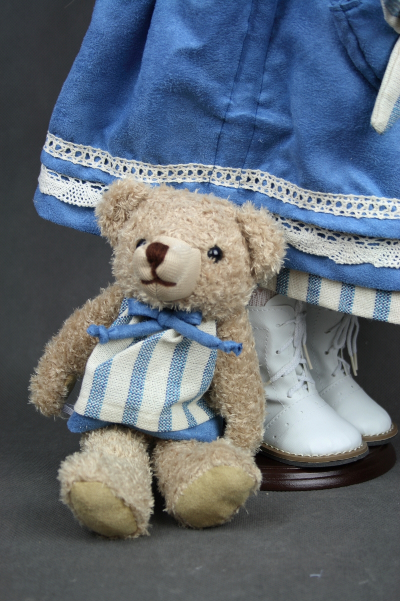 Je oblečená do šiat s kabátikom v kombinácii modrej a krémovej farby. Dlhé tmavé vlasy má rozpustené a hlavu zdobí klobúčik s kvetinovou aplikáciou. V ruke drží bábika medvedíka, ktorý je farebne zladený s oblečením bábiky.