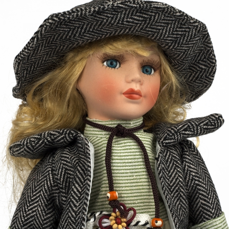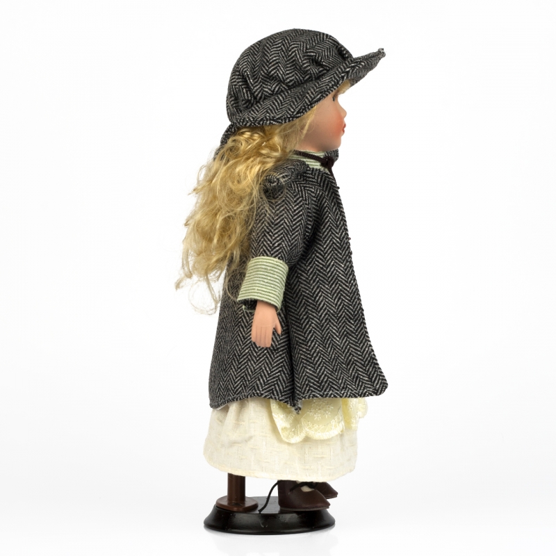 Porcelánová panenka je oděna do krémových denních šatů se spodničkou, které jsou ozdobeny korálky. Vrchní část pokrývá halenka v zeleném tónu, jejíž látka byla použita i na lemy rukávů kabátu. Módní kabátek je doplněn kloboučkem stejného vzoru. Na nožkách má hnědé šněrovací botičky.