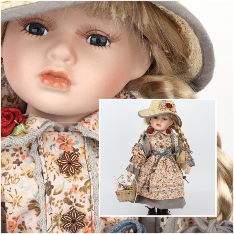 Porcelánová bábika Jasmína 40cm má krásne blonďavé copy, kvetované vidiecke šaty, slamený klbouk a v košíčka kvetiny z lúky.