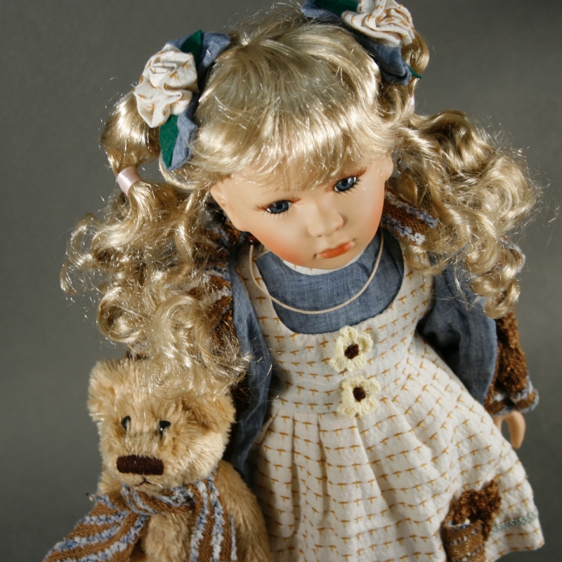 Bábika s látkovými kvietkami vo vlasoch drží v rukách plyšového medvedíka , okolo krku mu uviazala pruhovanú šál . Spoločne tvoria dokonalý pár , ktorý vyvolá úsmev na každej tvári .