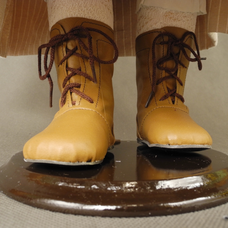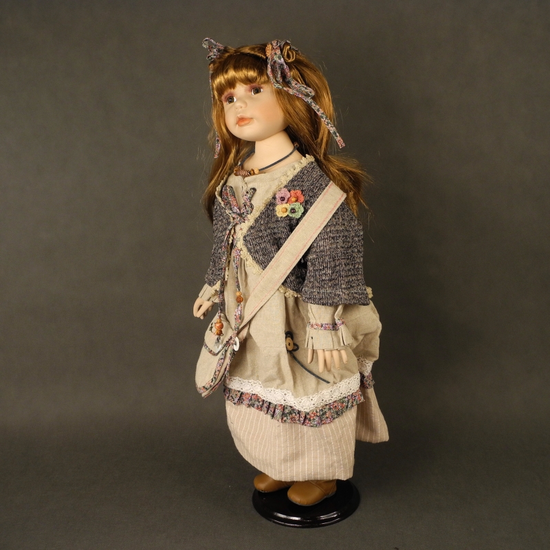Bábika má oblečené plátené šaty zdobrné čipkou a všitou farebnou látkou, modrošedý pletený svetrík a cez rameno plátenú kabelku.
