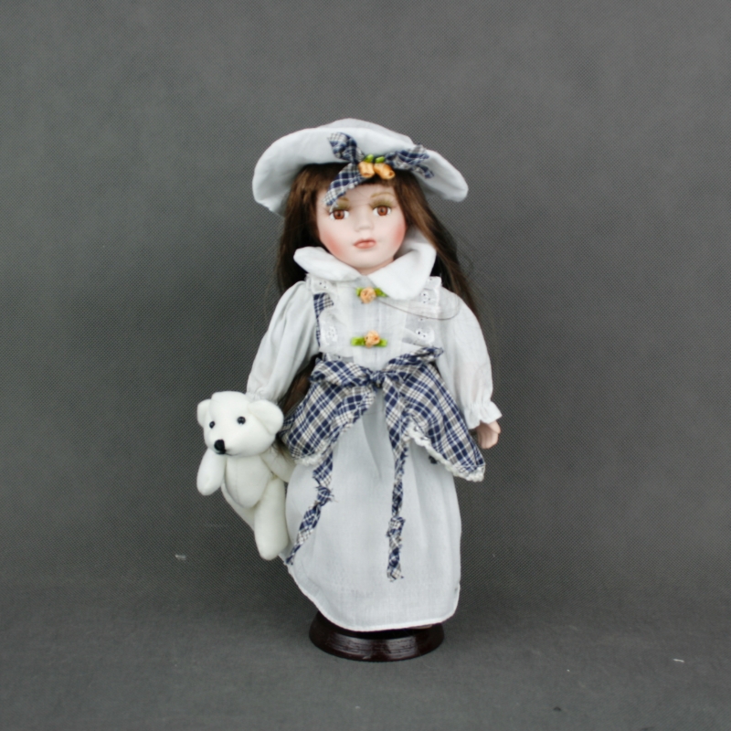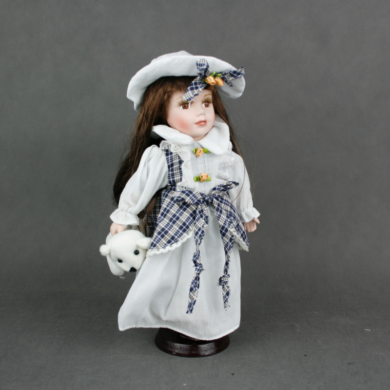 Porcelánová bábika Marta je oblečená do bielych šiat s károvanou modrou sukňou s trakmi. Dekolt jej zdobia dve ruže, okolo krku má golier, ktorý je súčasťou šiat.