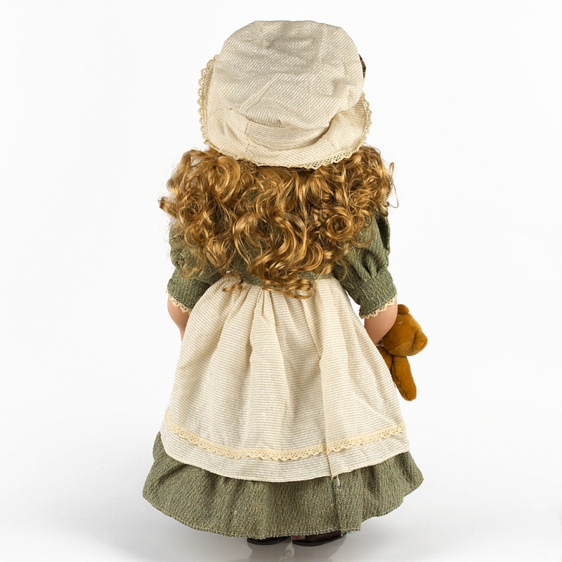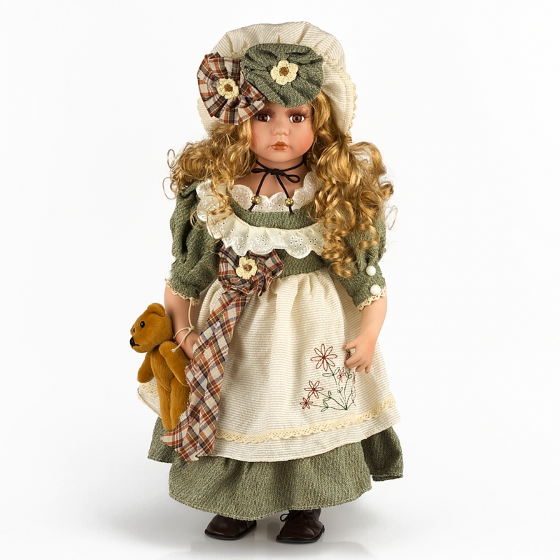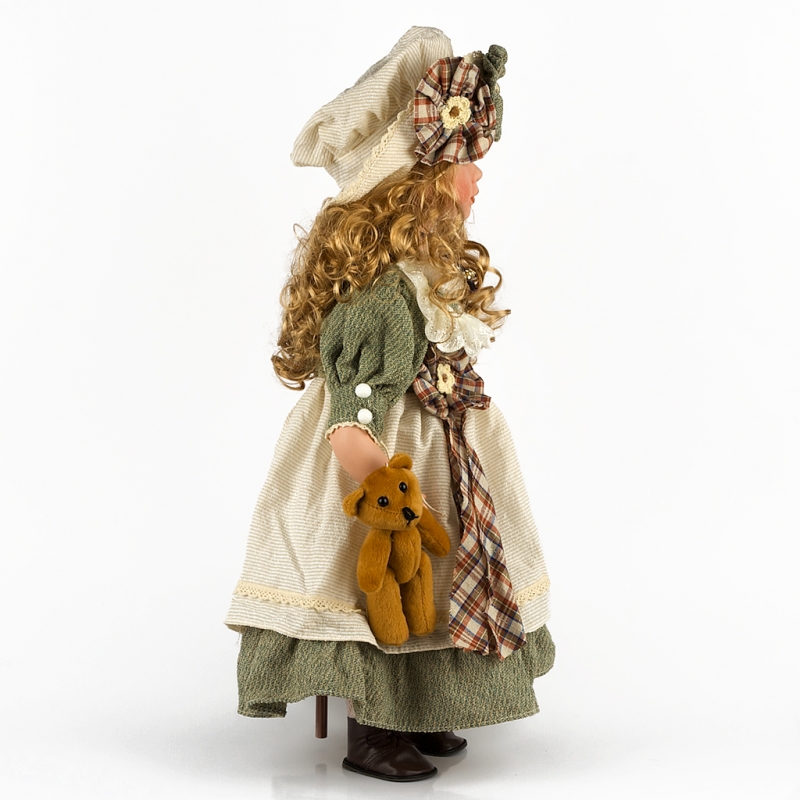 Porcelánová bábika s medvedíkom a látkovou kyticou 56cm