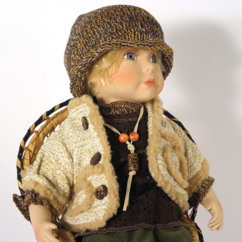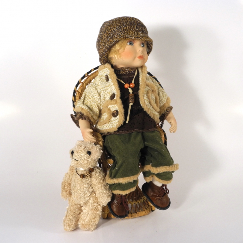 Je oblečený tak, aby neprechladli. Hlavu mu pokrýva hnedá čiapka, na tele má biely kožúšok s veľkými drevenými gombíkmi. Kožušinou sú lemované aj tmavšie nohavice, z ktorých mu vykúkajú silnejšie vlnené ponožky. Aj bábiky si asi rady hrajú, táto bábika - chlapec drží v rukách plyšového medvedíka.
