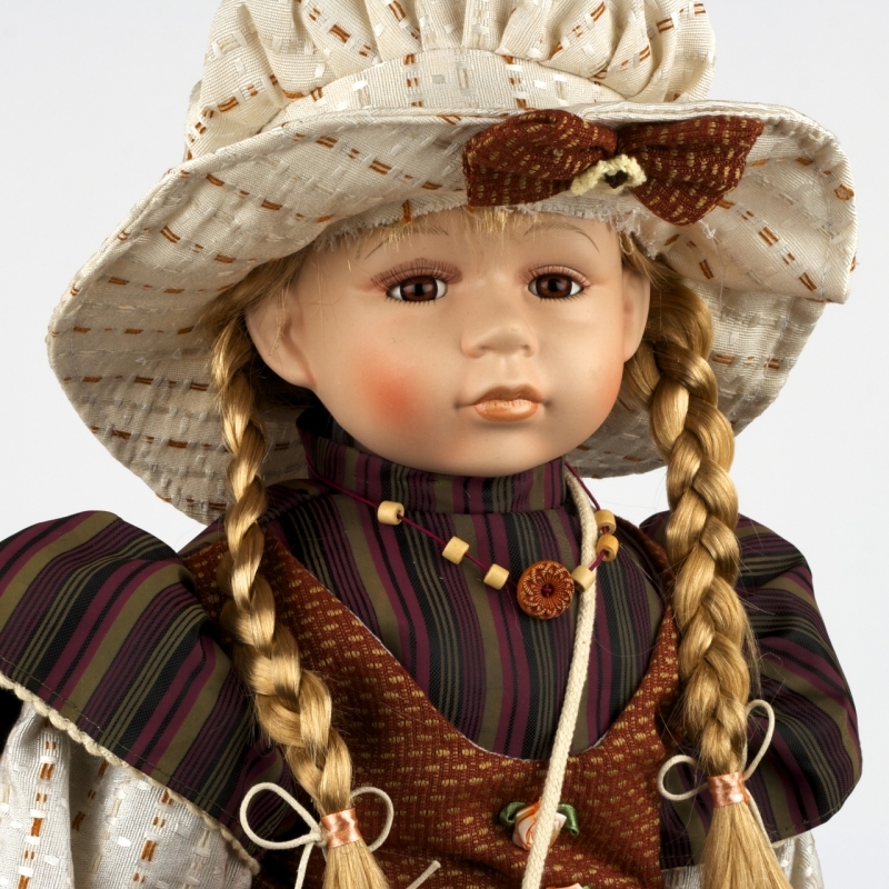 Blonďatá panenka s copánky. Hnědé šatičky s košilkou v krémově bílé barvě.