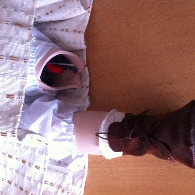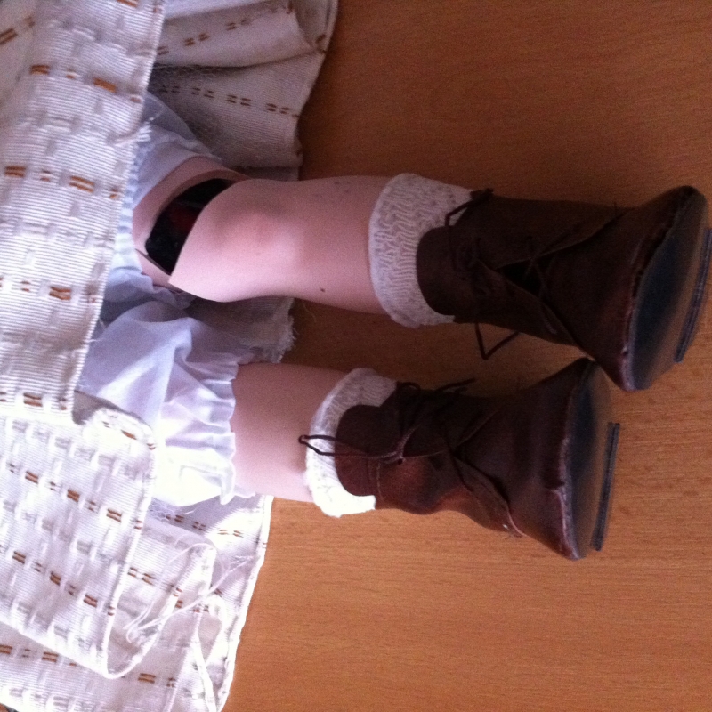 Panenka vyřazena z důvodu poškození jedné nohy. Porcelánová noha je zlomená v místě nad kolenem. Panenku tedy nelze postavit na stojánek, ale bez problémů je možné panenku posadit do jednoho z kočárků pro porcelánové panenky.