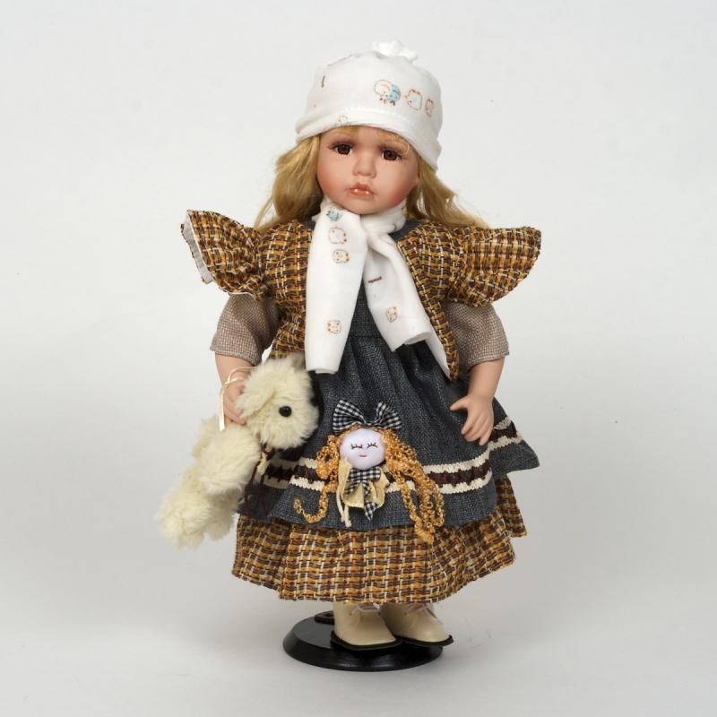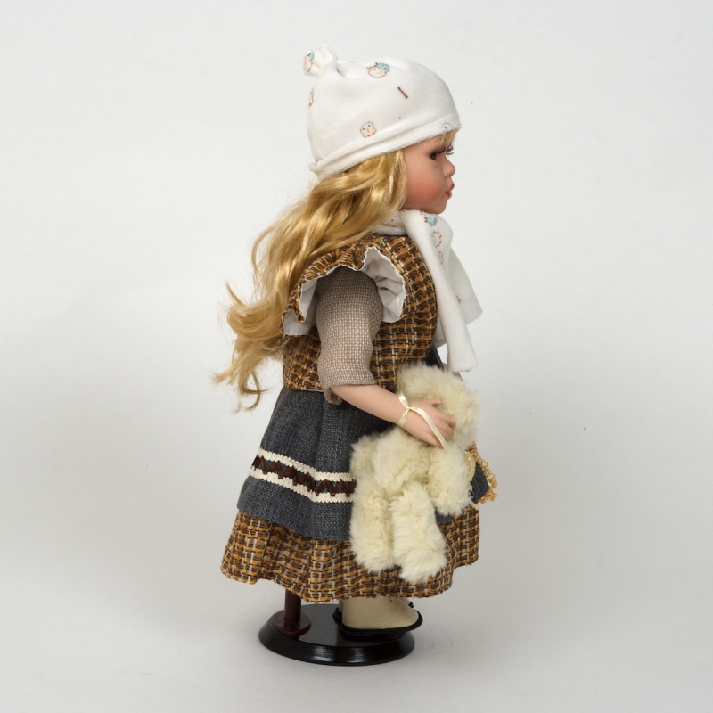 Porcelanová panenka ve svátečních šatech s šálou. Porcelanová panenka ve svátečních šatech s šálou a medvídkem. 42cm celková výška. Kolo na obrázku je poze dekorace.