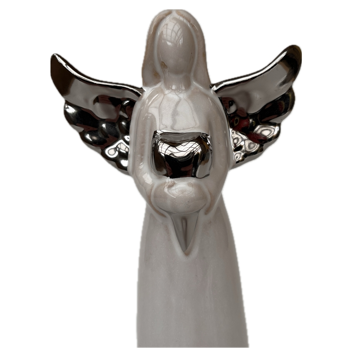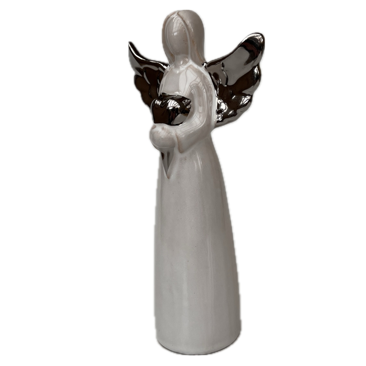 Jemný porcelánový anjel s lesklými krídlami a srdcom v rukách vnesie do vášho domova pokoj, nehu aj kúsok vianočnej atmosféry. Vysoký 20,6 cm, ideálny na policu, komodu alebo parapet.