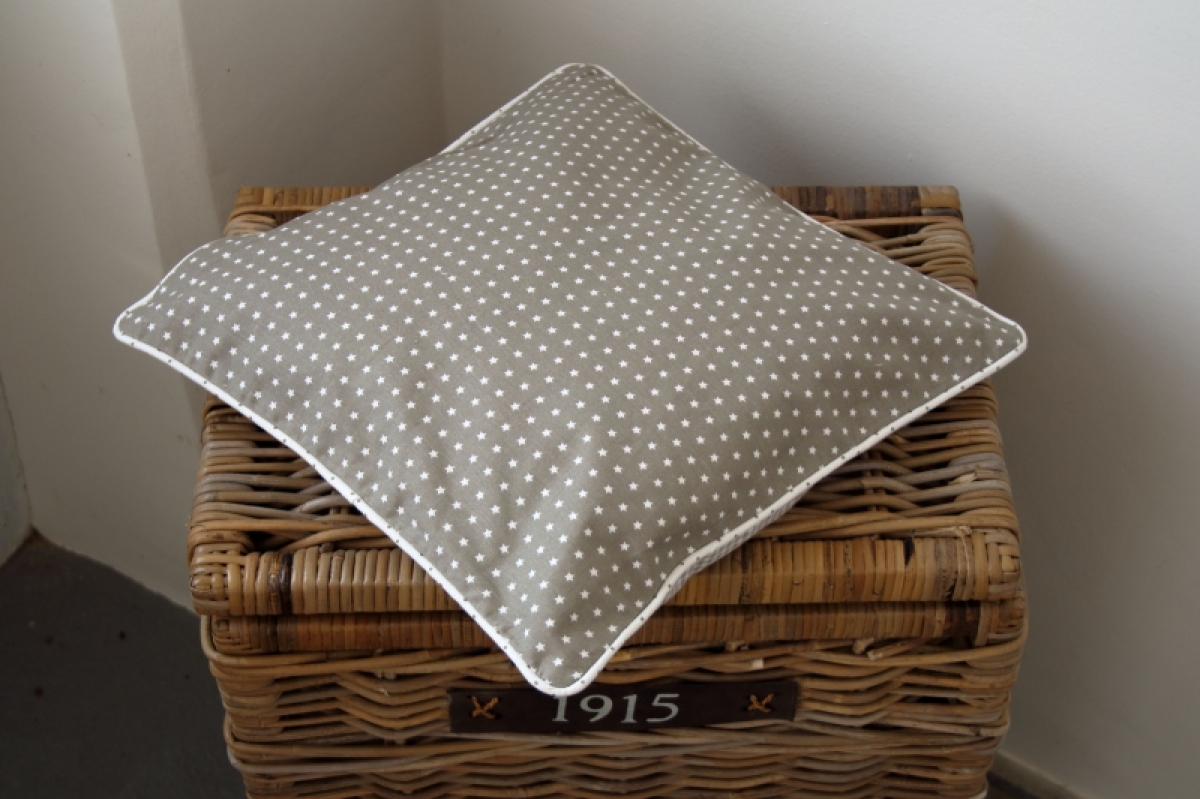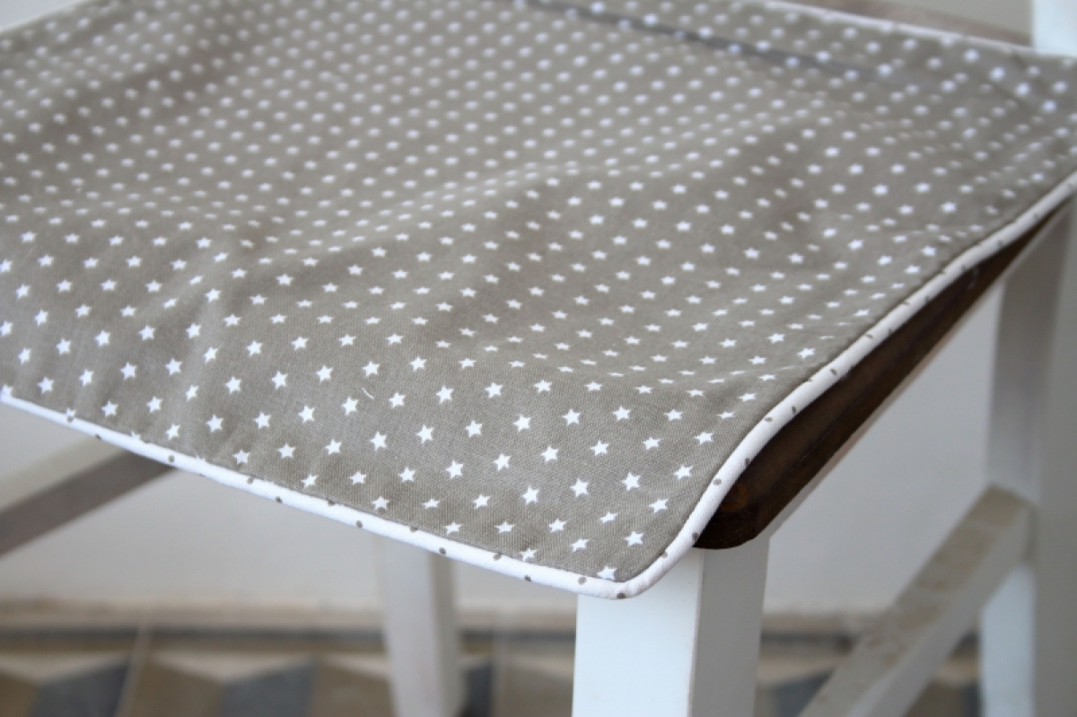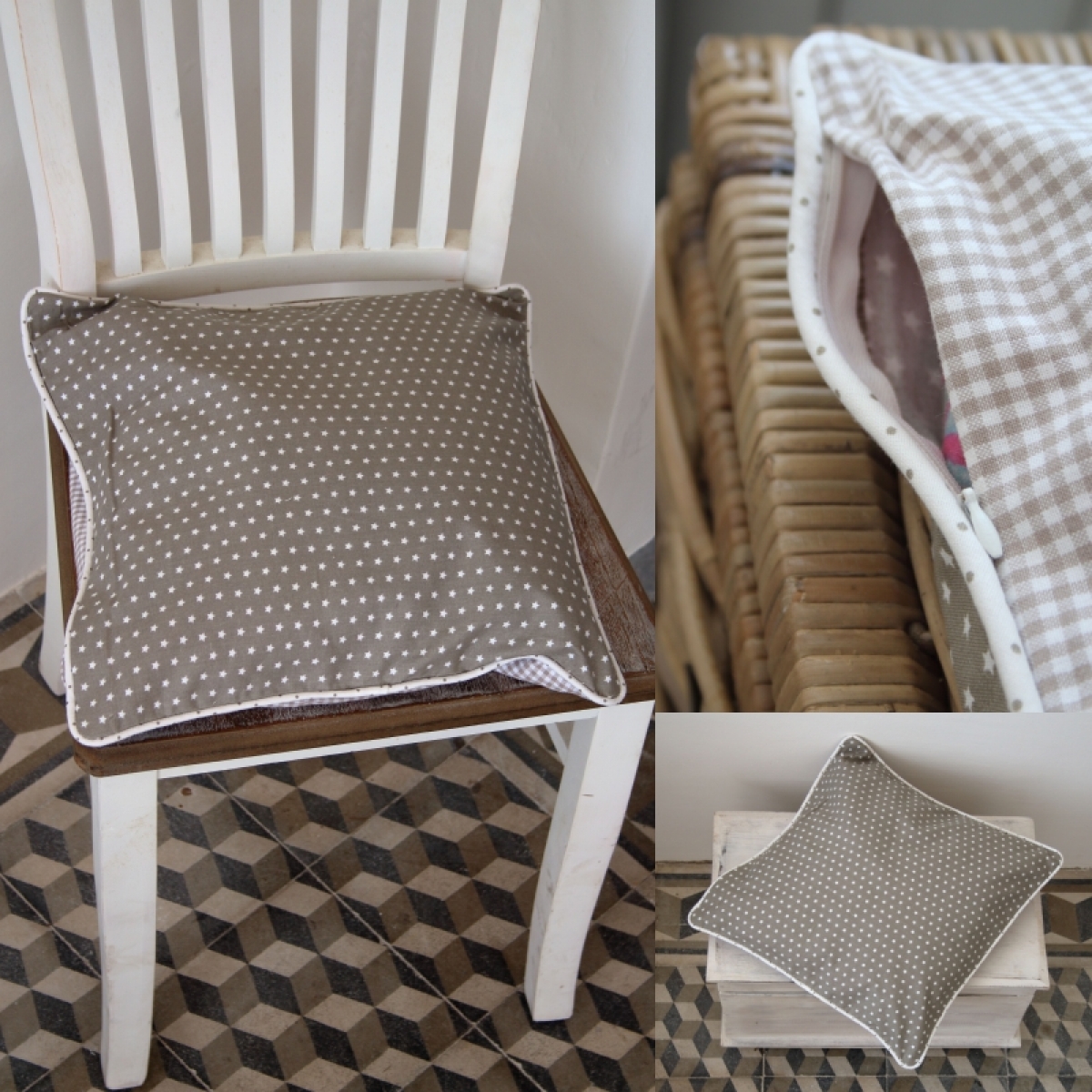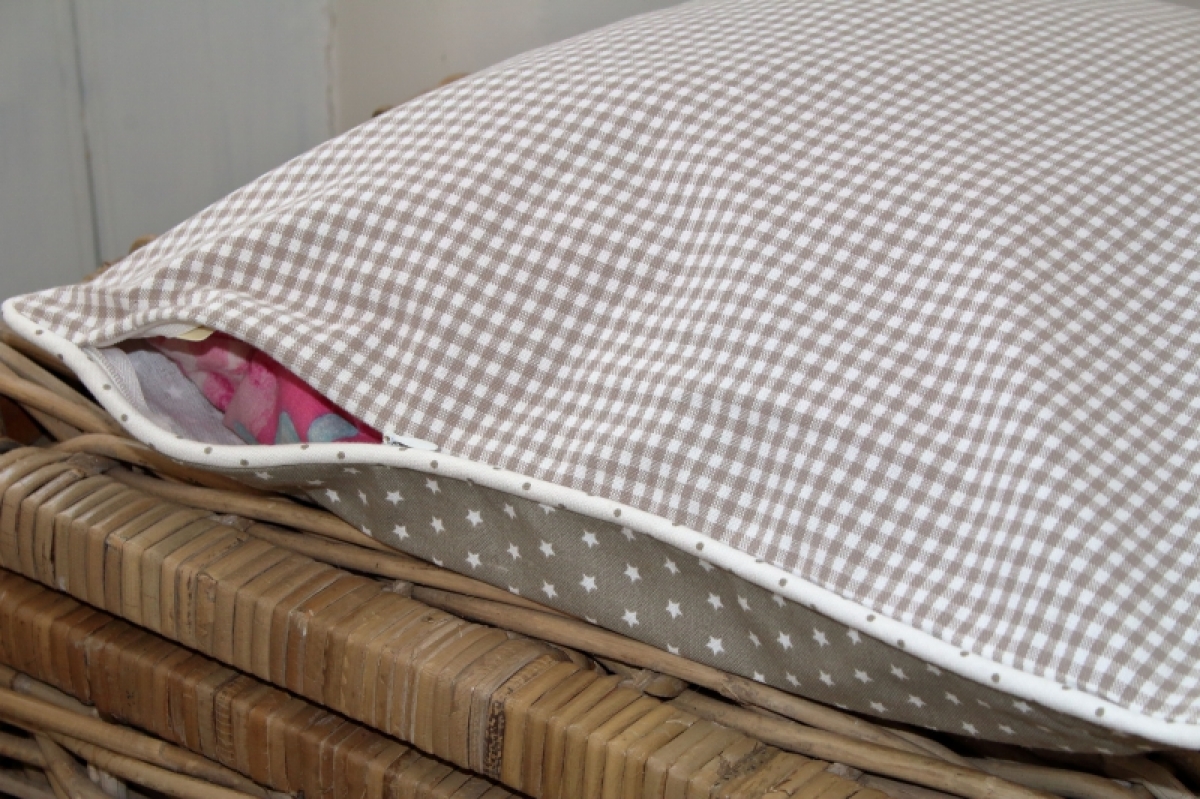 Decentné béžová farba v kombinácii s bielou sa opakuje na oboch stranách povlaku. Na jednej s motívom hviezdičiek, na druhej v jemnej kocke. Zapínanie je na zips.