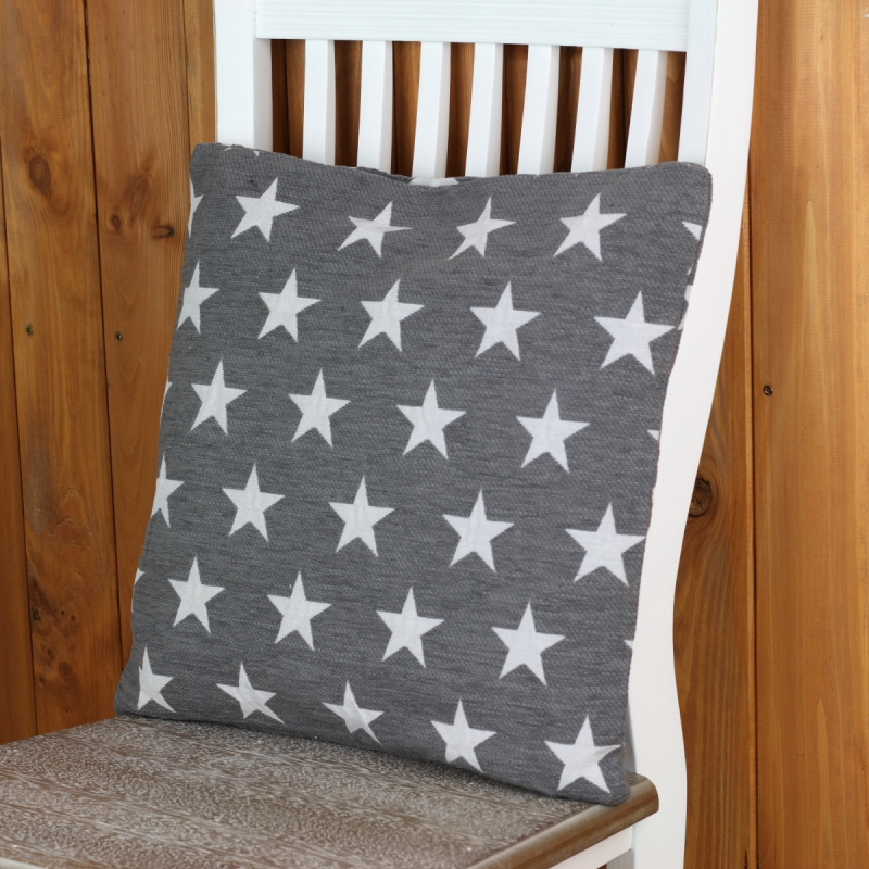 Povlaky sú ušité z kvalitnej silnej látky s jemným vrúbkovaním. Tento je tmavo šedý s bielymi hviezdami z oboch strán. V rovnakom dizajne, ale v iných barevnách kombináciách nájdete povlaky nižšie. Skvele sa tak kombinuje s ostatnými farbami v interiéri, keďže biela a šedá sú veľmi univerzálne.