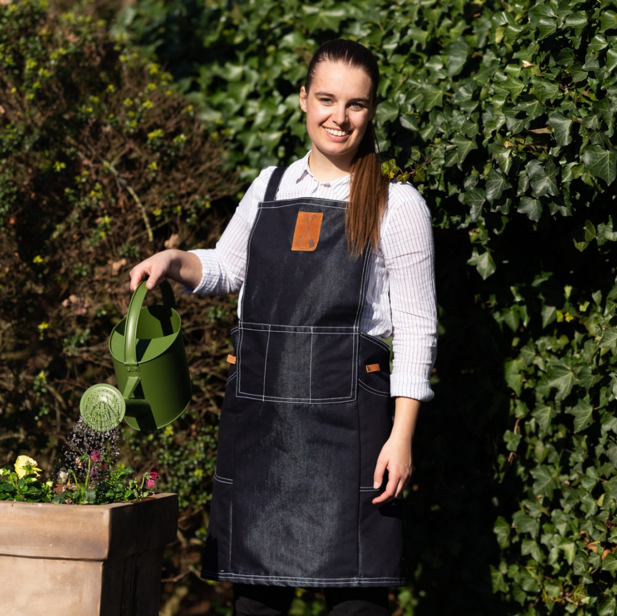 Pracovná zástera má kríž cez chrbát a je vybavená niekoľkými priestrannými vreckami, ktoré možno použiť na záhradné nářadí.