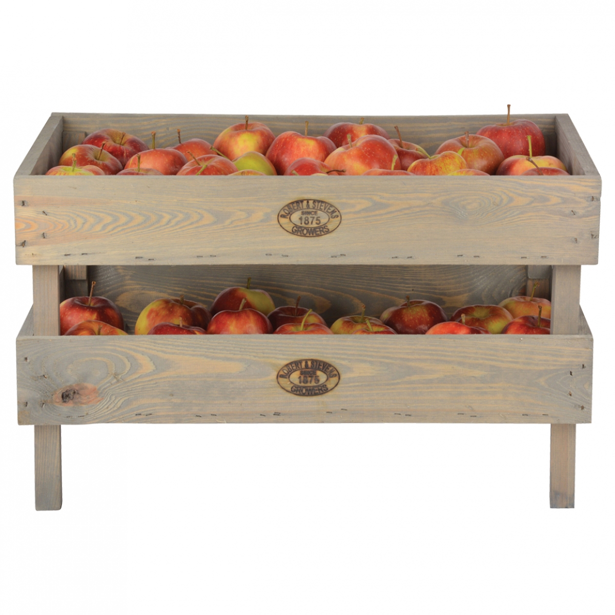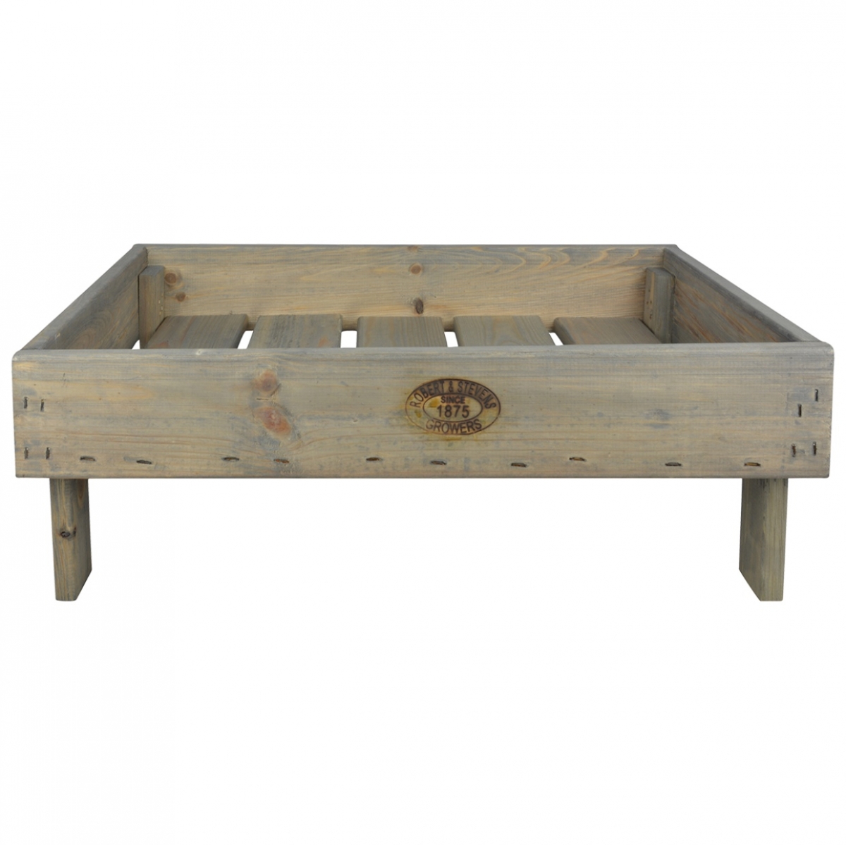 Prepravka je vyrobená z borovicového dreva, namoreného šedou farbou, a jej prednú stranu zdobí vypálené logo, na ktorom stojí ROBERT and STEVENS, SINCE 1875, GROWERS.