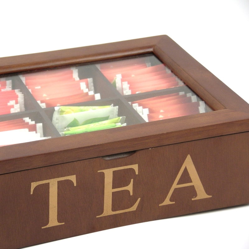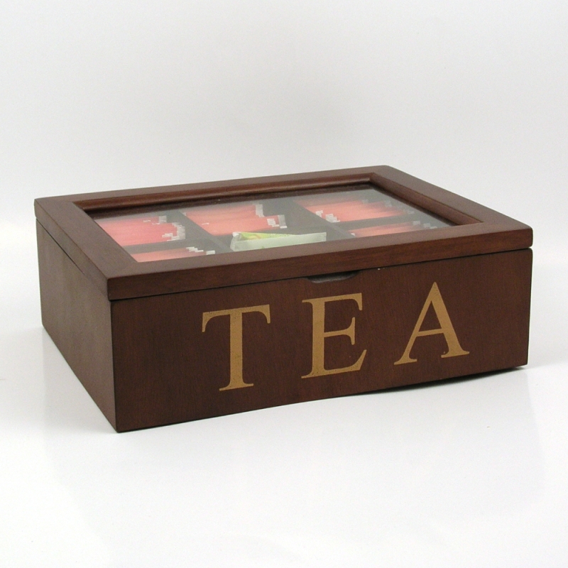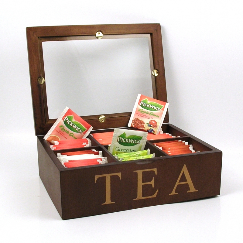 Krabička na čaj presklená o veľkosti 24x18x8,3cm. Pri otvorení, výška 25cm. Krabička je rozdelená na šesť rovnakých priehradok na prehľadné uloženie čajových sáčkov. Na prednej strane krabičky je zlatý nápis Tea.