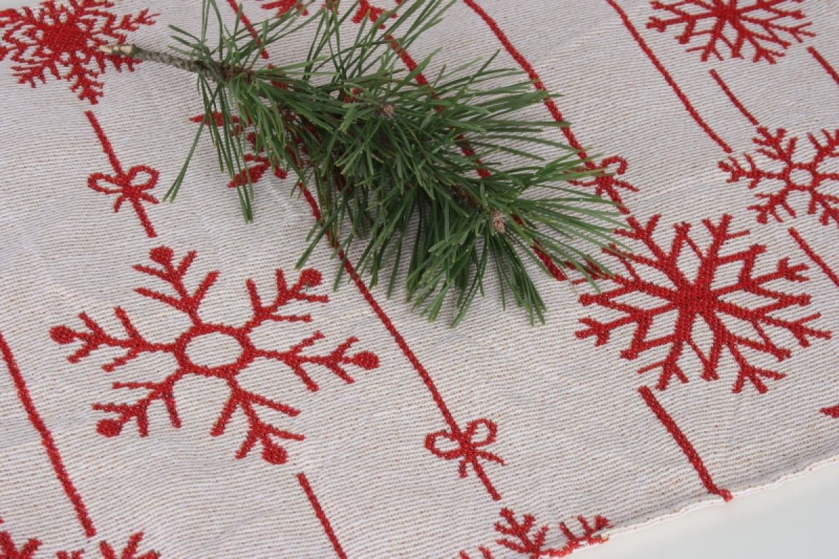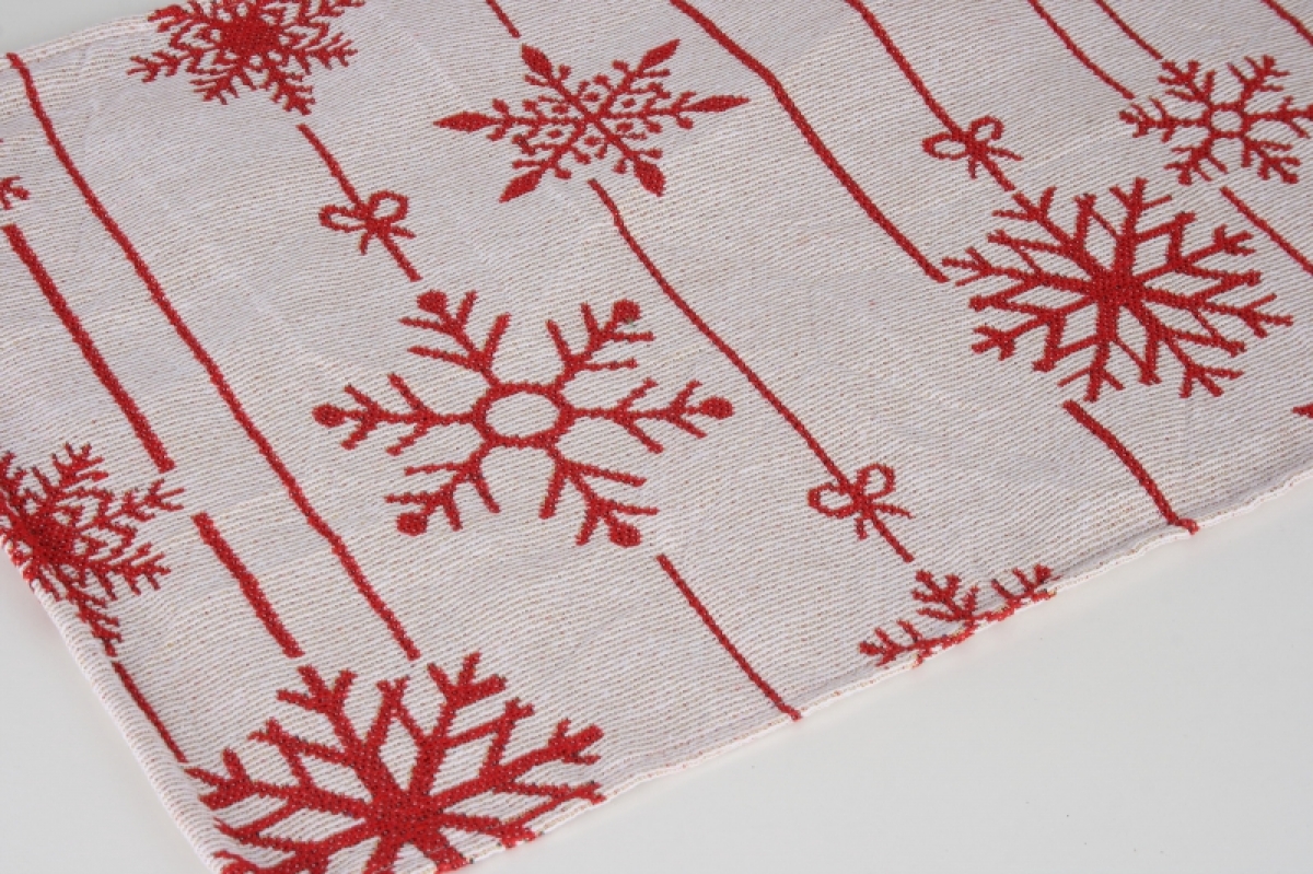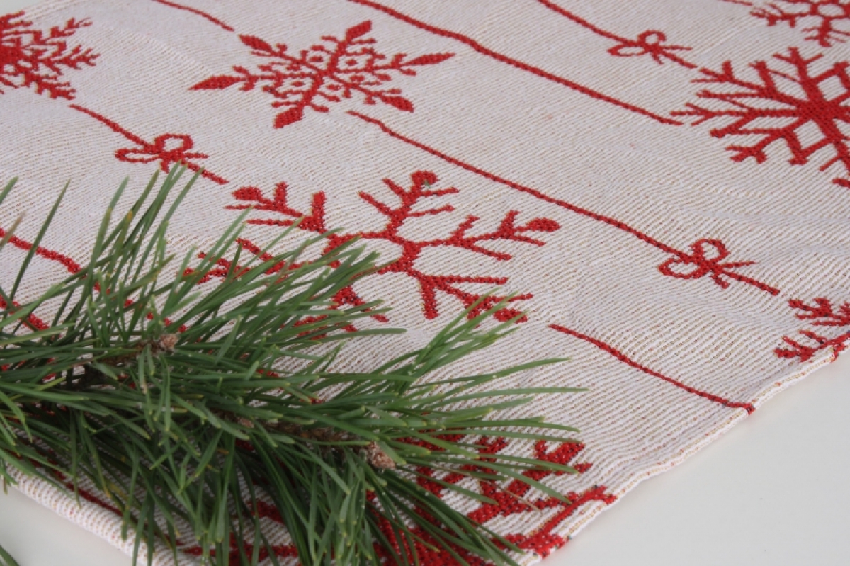 Prestieranie s motívom červených vloček určite patrí k slávnostne usporiadanému stolíku. Rovnako tak bude krásne vypadať na staré komode alebo truhlici vo vaší chalupe.
