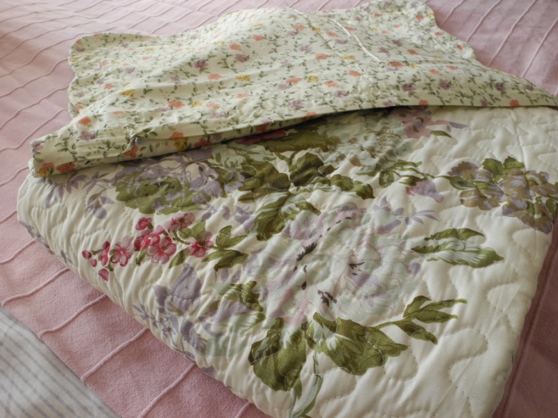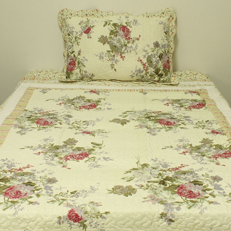 Prikrývka na jednolôžko patchwork kvetinové 140x200cm vo veľmi decentným krémovom prevedení s veľkými kvetmi ladenými do ružovo-fialovej farby.