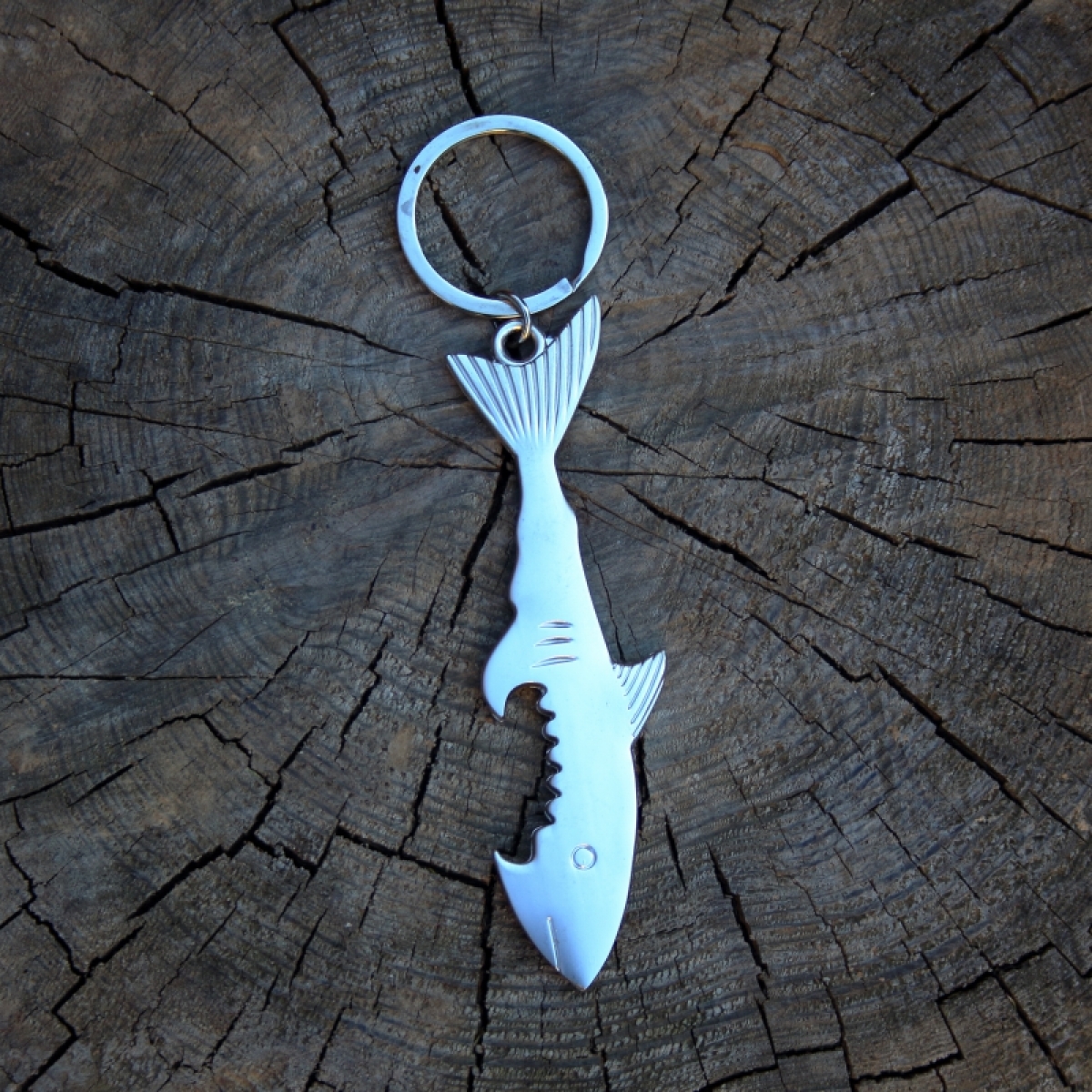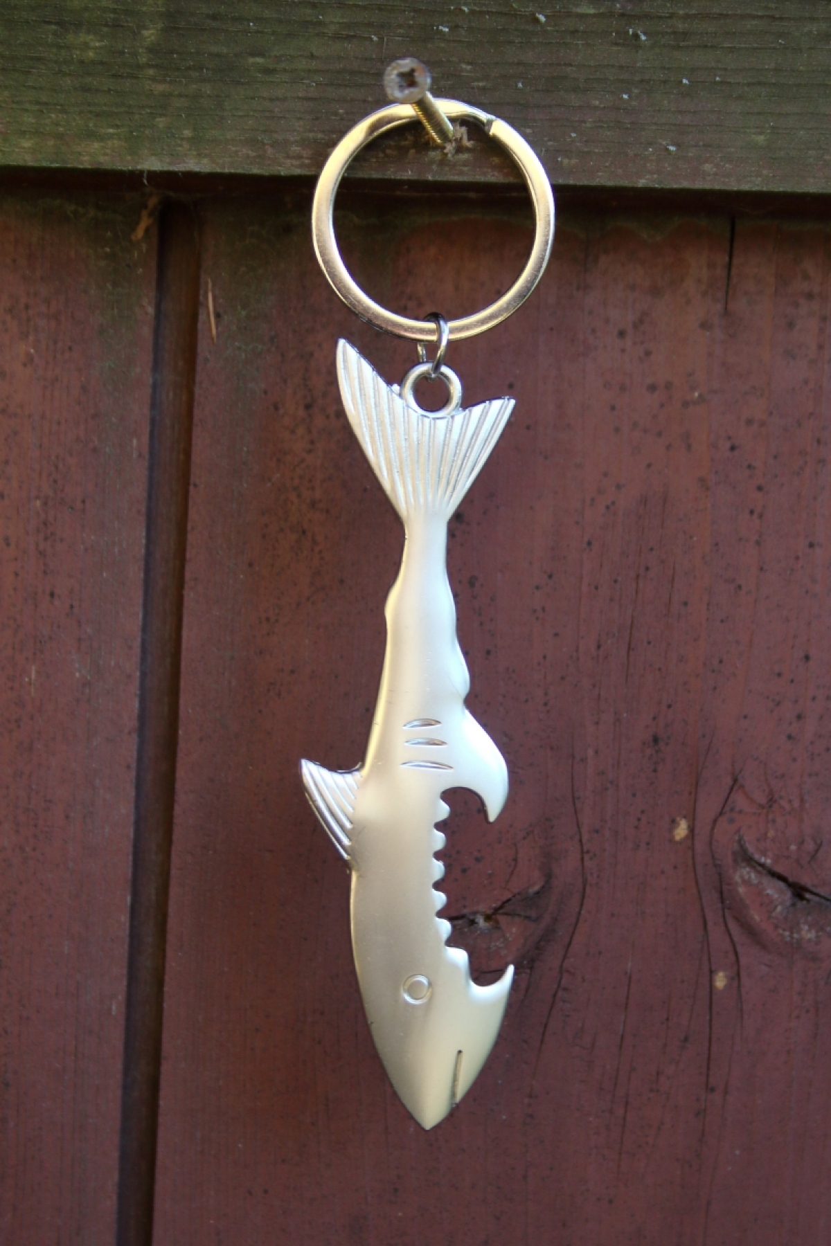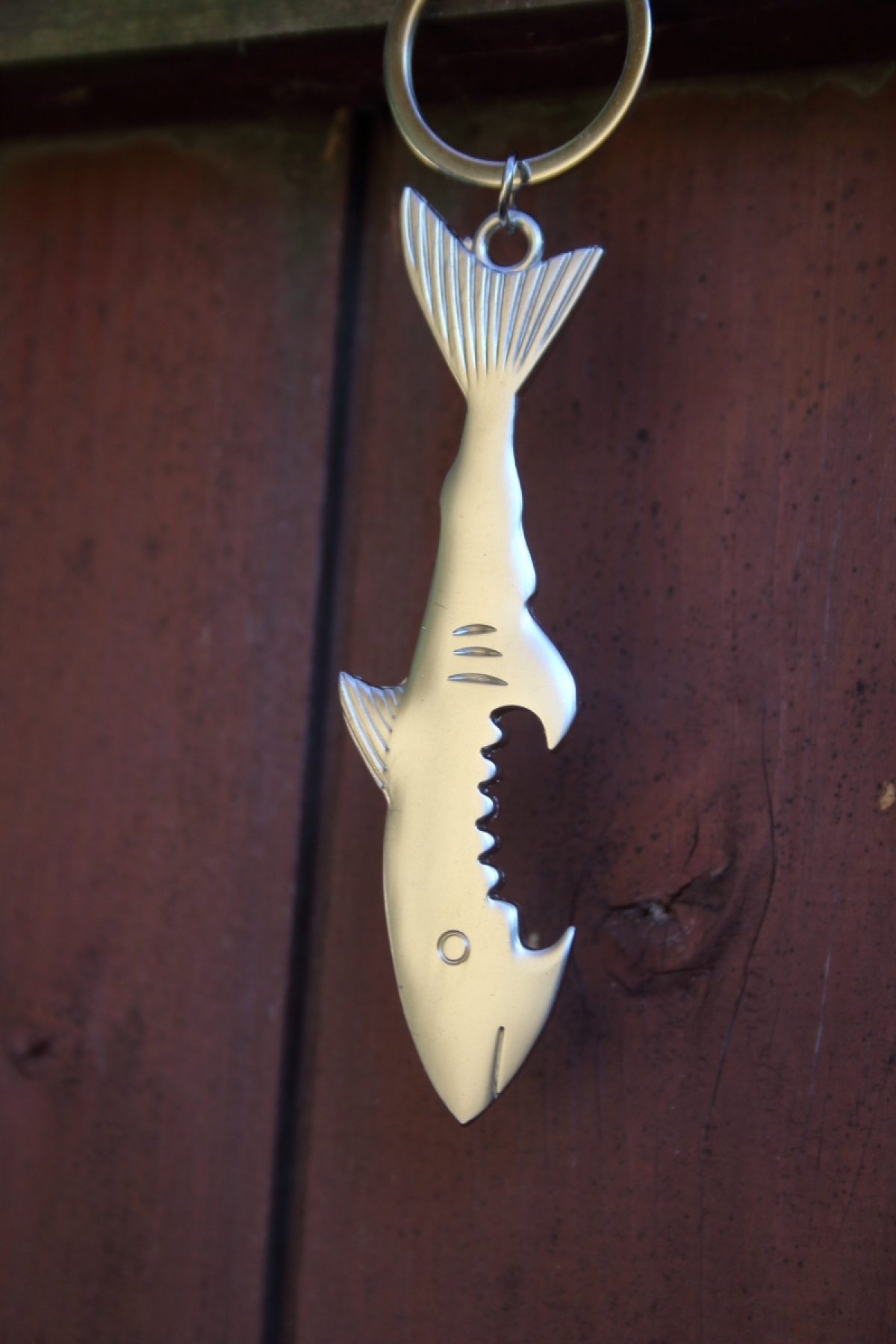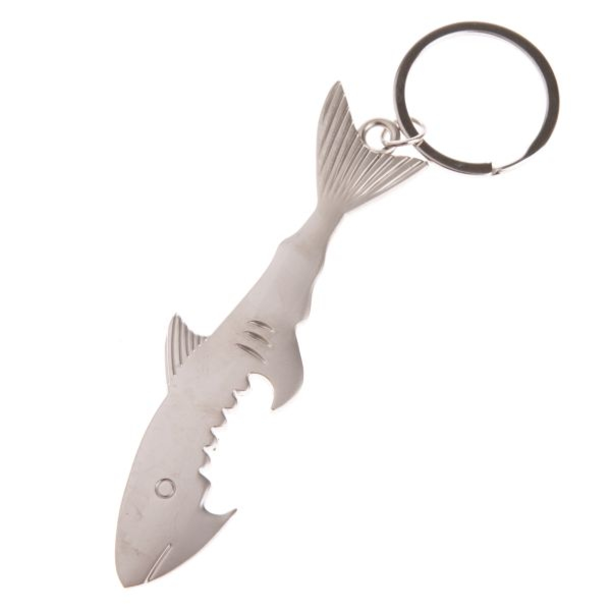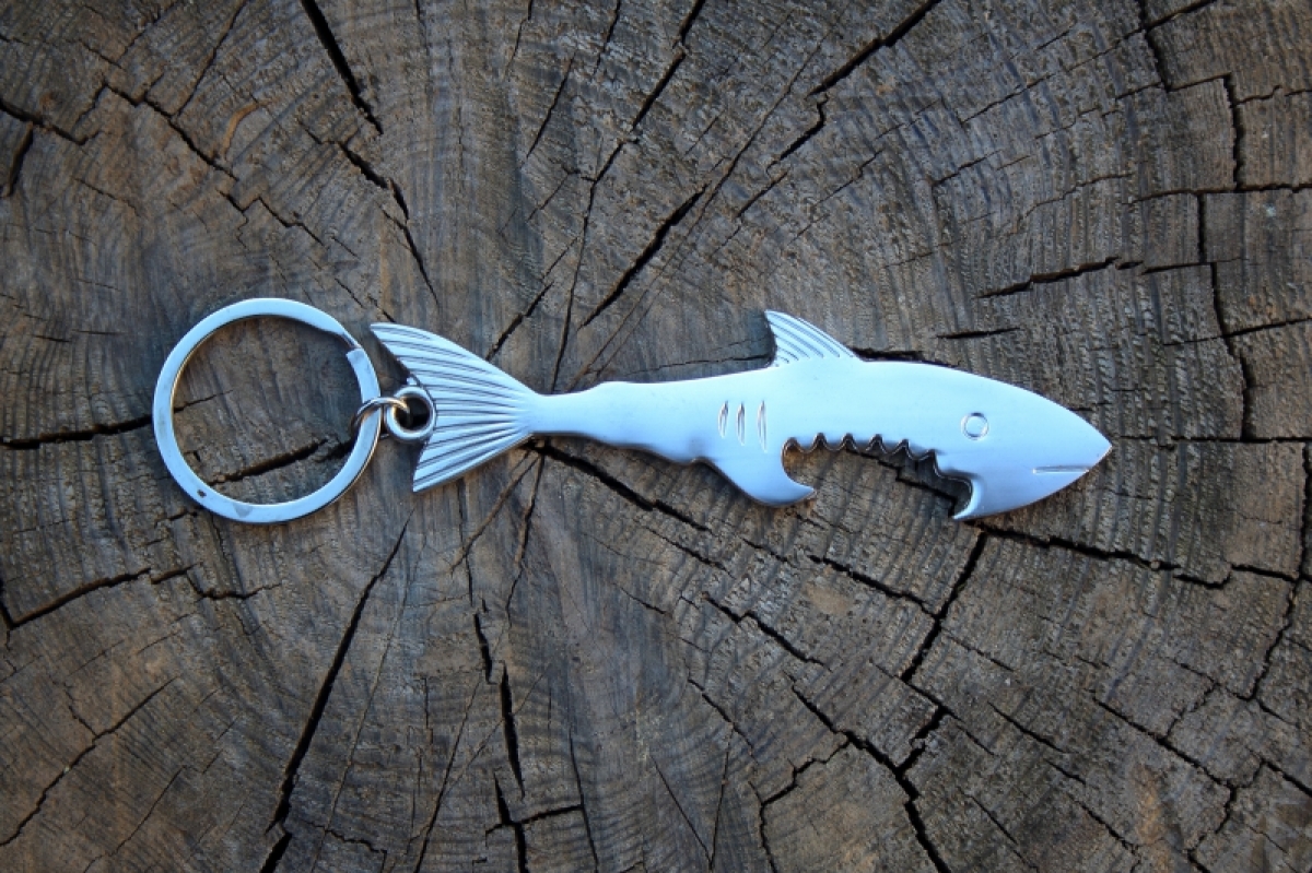 Prívesok na kľúče s motívom žraloka slúžiace ako otvárač