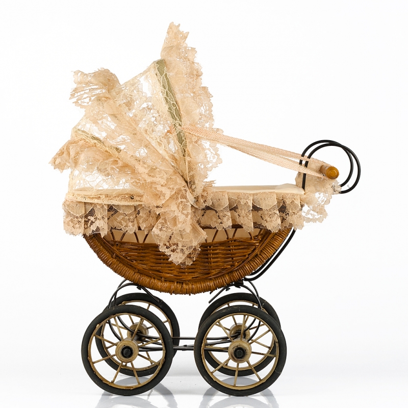 Celkové rozměry kočárku jsou výška 39cm, šířka 20cm a hloubka 34cm. Alternativní názvy: kočárek, kočár, z proutí, starodávný, retro.