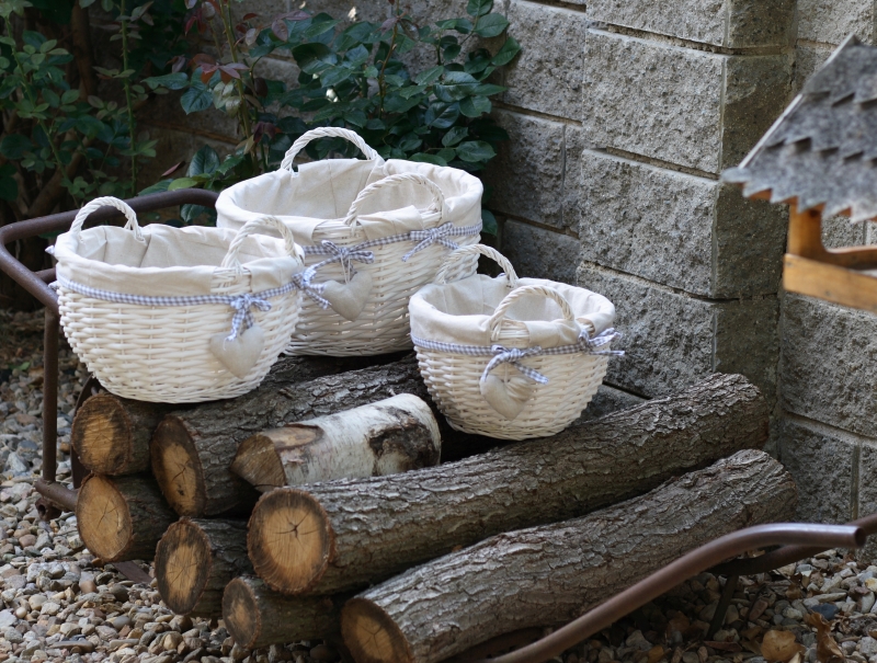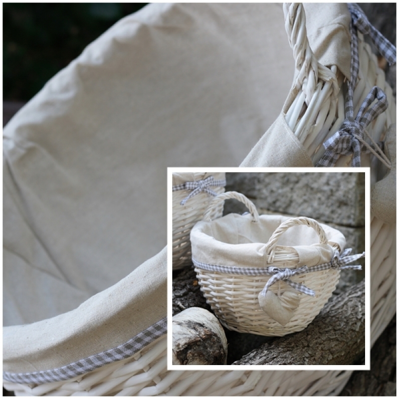 Prútený kôš z bieleho prútia s krásnou textilnou vložkou lemovanou bielo-modro kockovanú stužkou priam sála nežnosť a romantiku. Každý košíček je doplnený šitým srdiečkom. prútené koše
