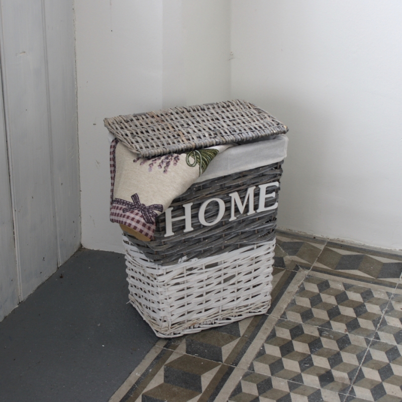 Kôš má praktické veko, ktoré všetko schová a kôš tak bude ozdobou interiéru. Kôš je kombinovaný do tńů šedej a bielej farby, na prednej strane je veľký nápis HOME.