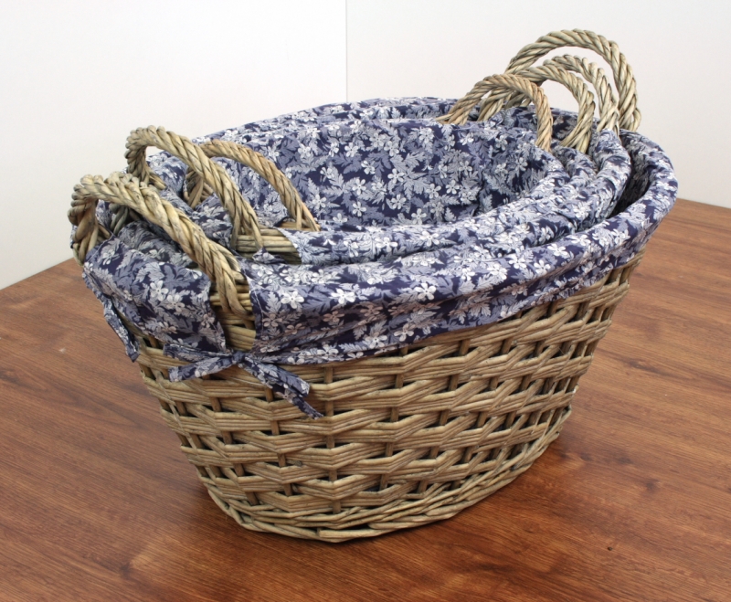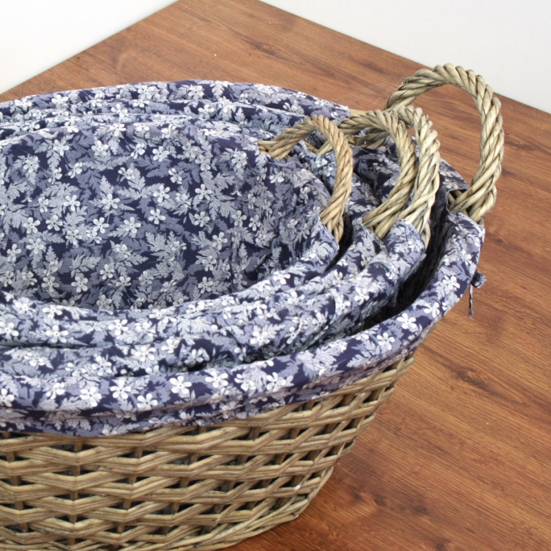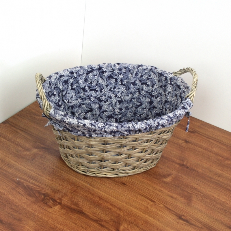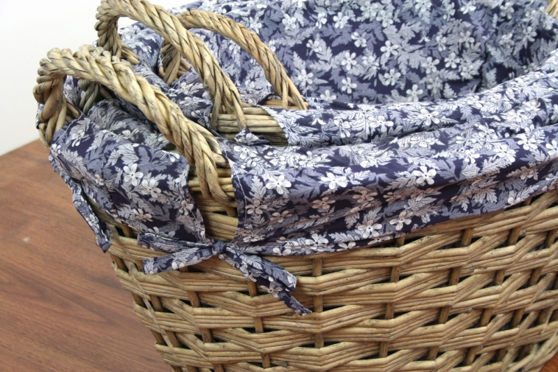 Koš je měkce vystlán modrobílou kytičkovanou látkou.