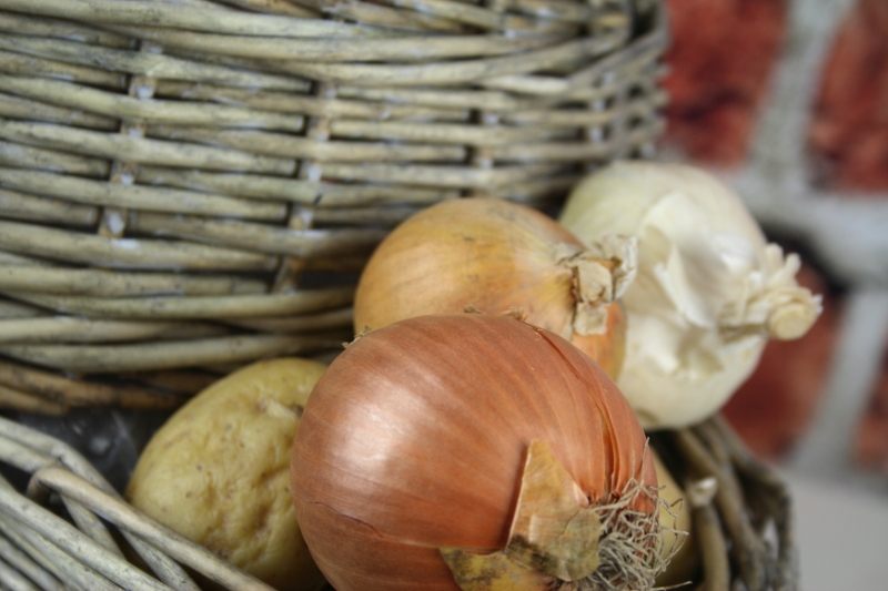 Opatrně naskládaná cibule v koši krásně dýchá a ze spodní části již odebíráte množství dle potřeby.