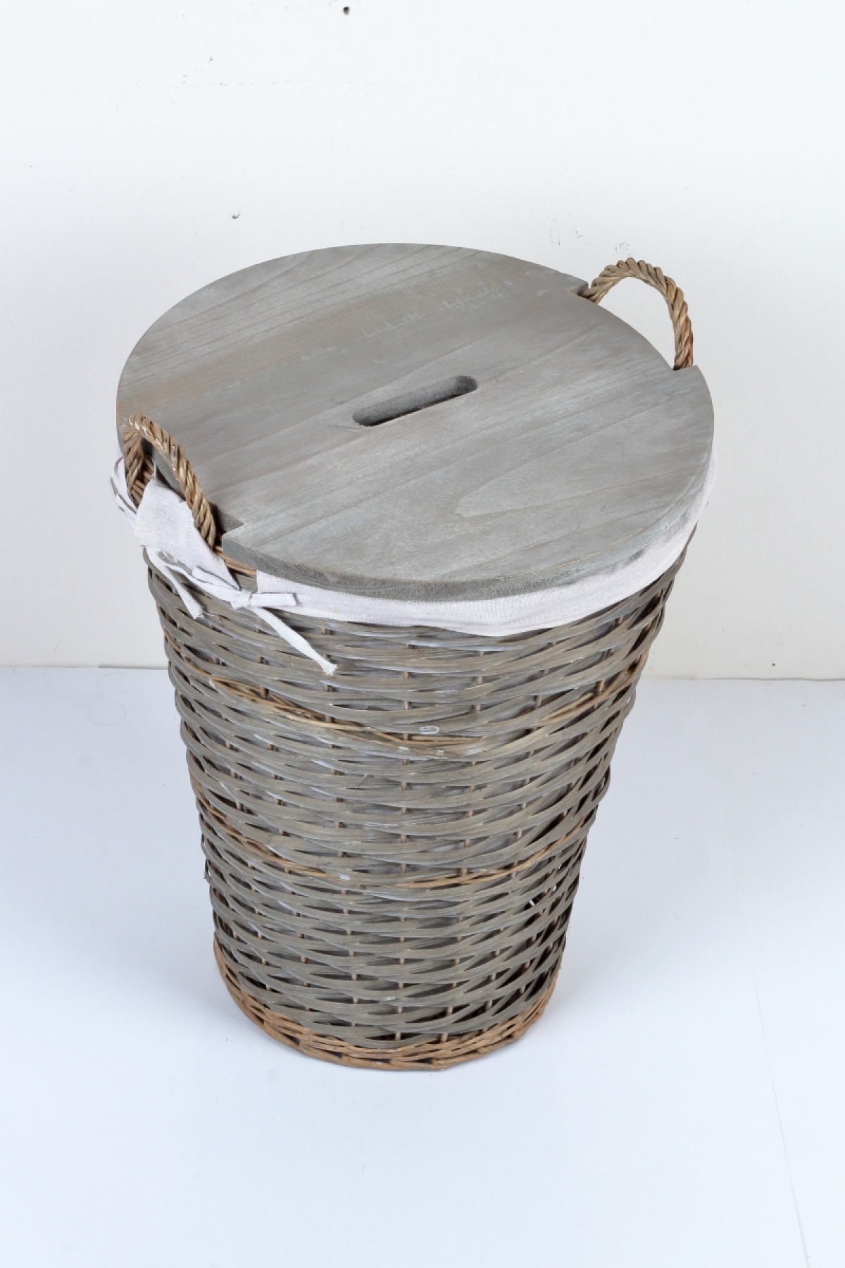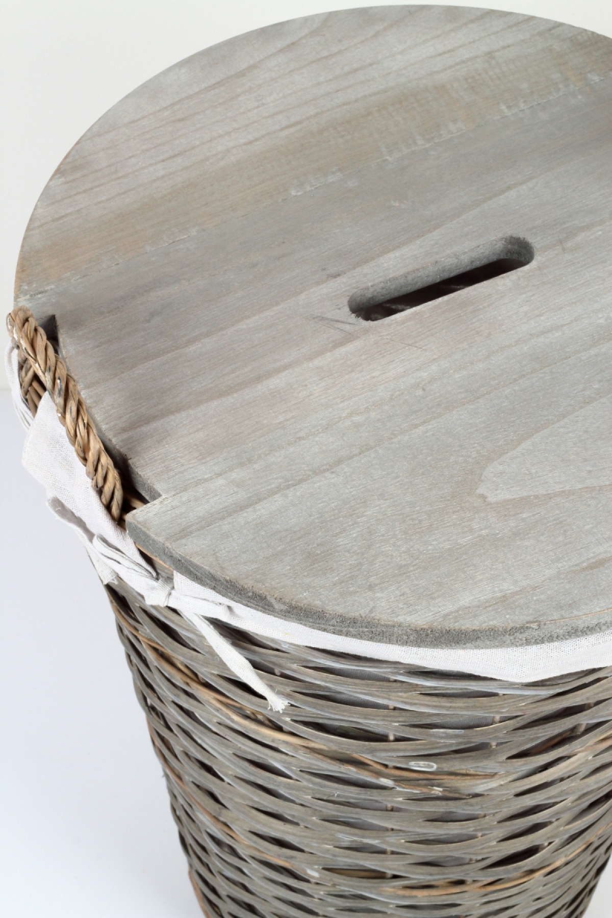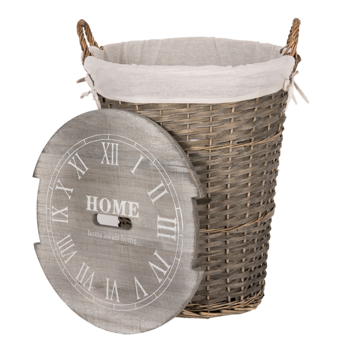Prútený kôš s látkovým poťahom 47x45x61cm môže slúžiť napríklad ako kôš na bielizeň, pretože má šikovné drevené veko, ktoré všetko ukryje.