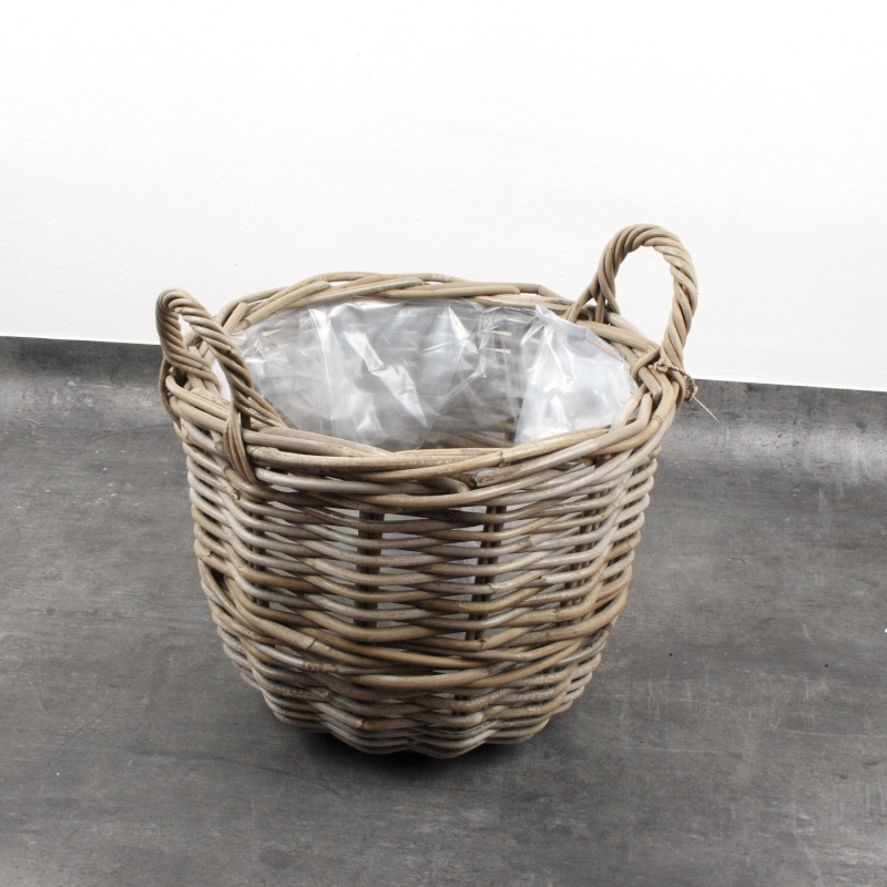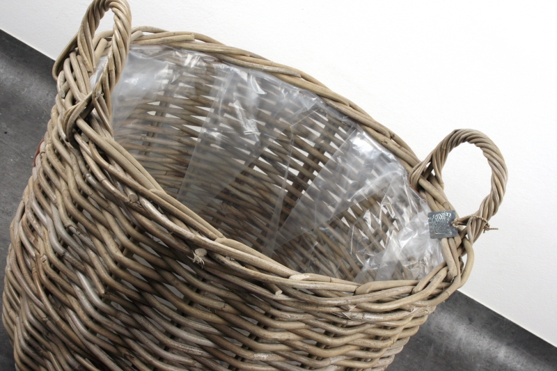 Prútený kôšík s ušami 40cm má vnútri igelitovú výplň a tak ho môžete bez starosti použiť ako obal na kvetinu. Hlina neprepadá a voda nepretečie.
