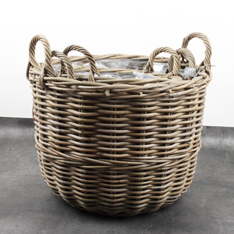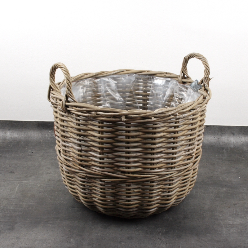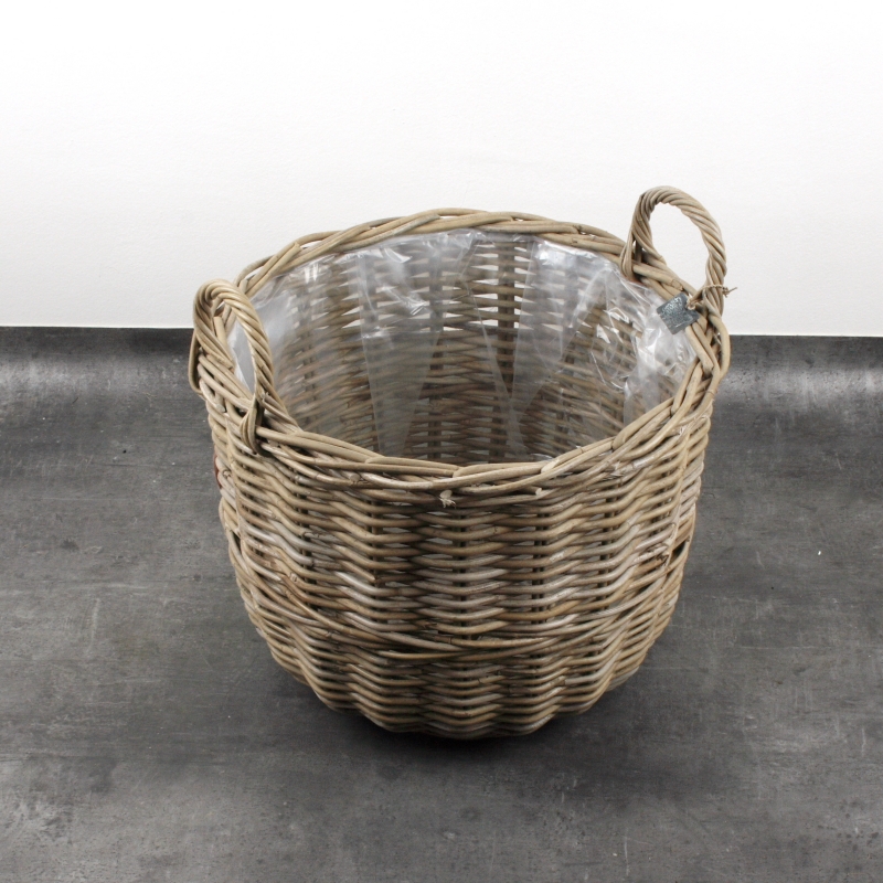 Prútený kôš s ušami na vianočný stromček 46cm má vnútri igelitovú výplň a tak ho môžete bez starosti použiť ako obal na kvetinu. Hlina neprepadá a voda nepretečie.