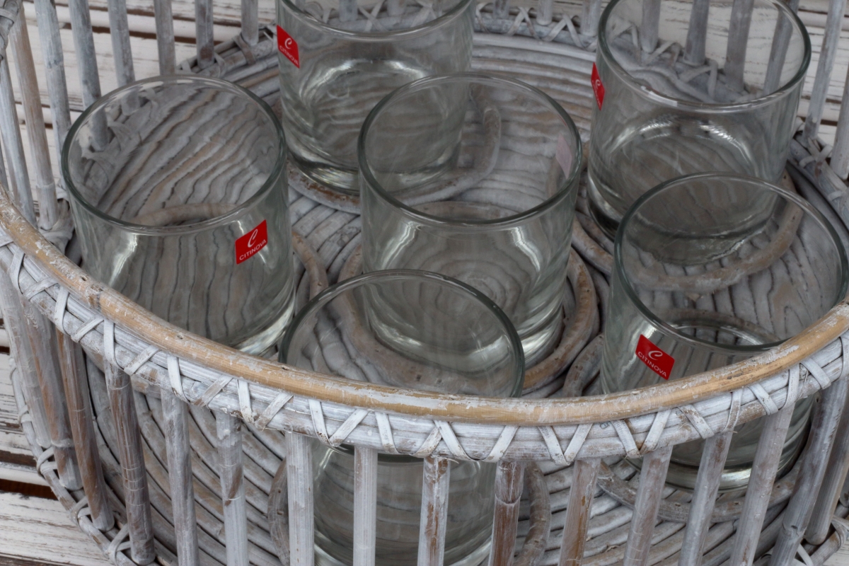 Podnos so šiestimi sklenenými kalíšky na čajové sviečky má jemnú patinu a pôsobí veľmi elegantne.