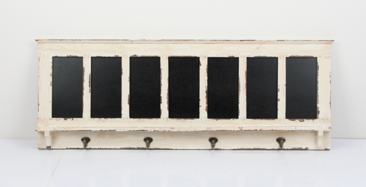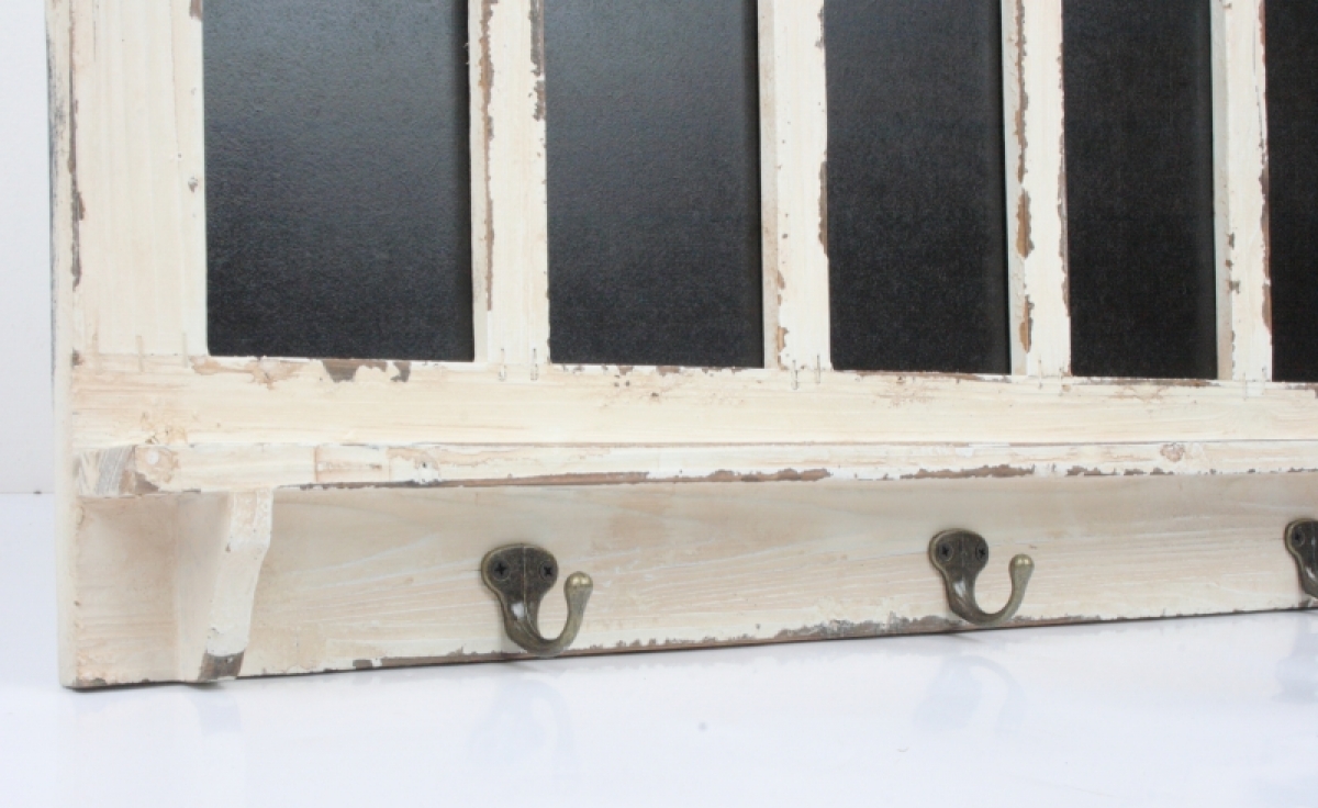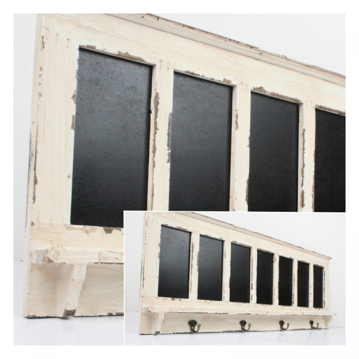 Úžasný drevený rám s výraznou patinou a otlčeným vzhľadom rozdeľujem tabuľu celkom na 7 tabuliek na písanie. Nad háčiky je navyše pripevnená malá police na drobnosti.