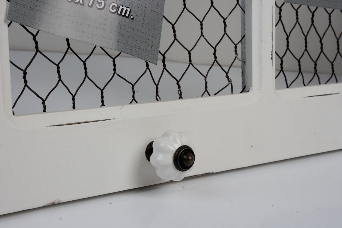 Rám pripomínajúce staré okno má v spodnej časti drôtený výplet s štipce na pripevnenie fotiek. Horná časť je presklená a fotografie sa do týchto častí vkladajú ako do klasického fotorámika.