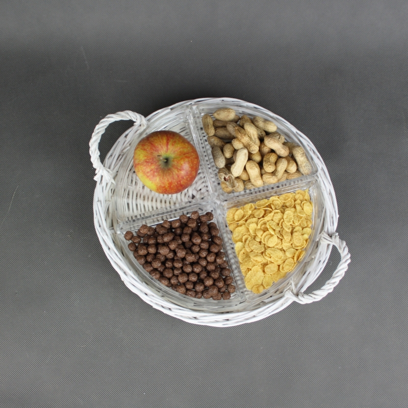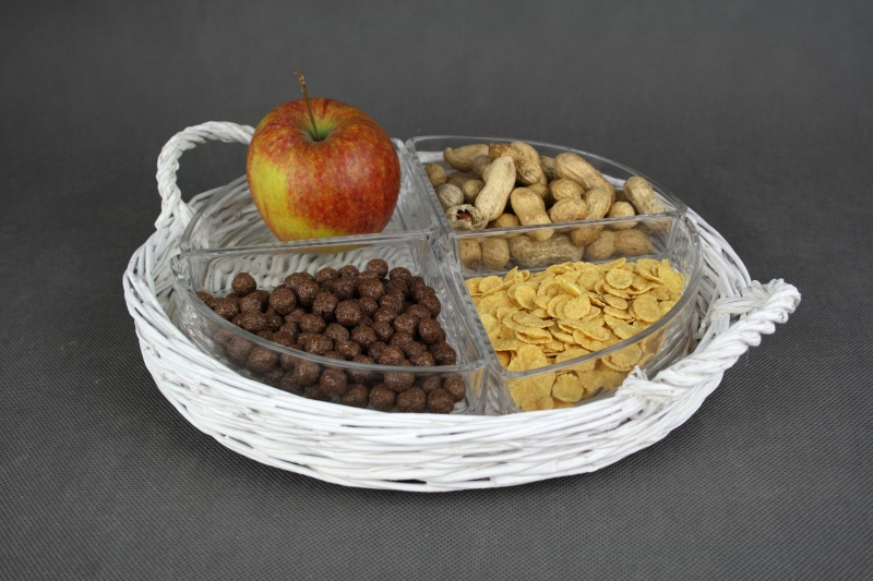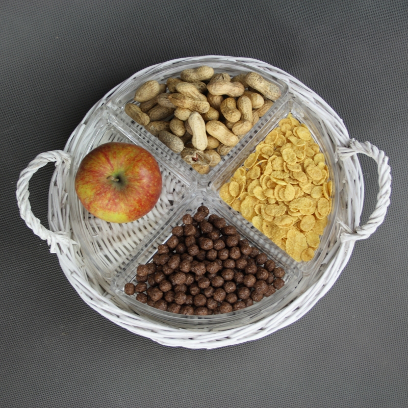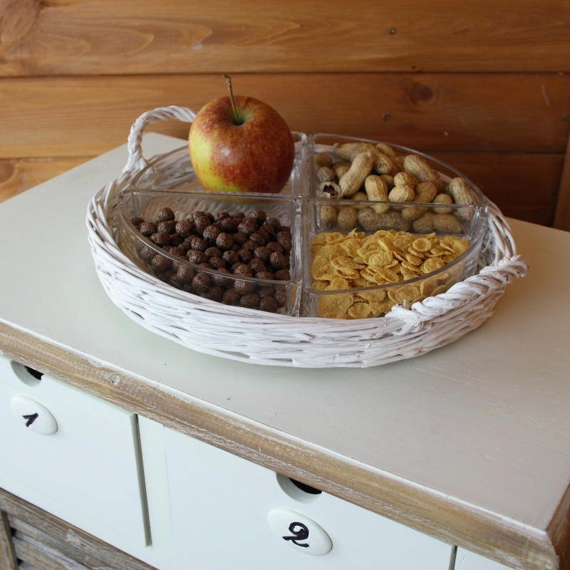 Ratanový podnos sa zapáči každému, kto rád maškrtí. Podnos má štyri sklenené misky, ktoré je možné jednoducho vybrať a umyť. Môžete teda mlsounům rozmaznávať všetko čo majú radi - oriešky slané i sladké, zdravá semienka alebo rôzne drobné sladkosti.