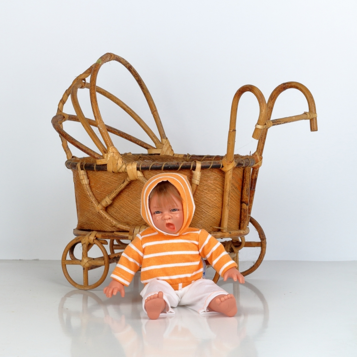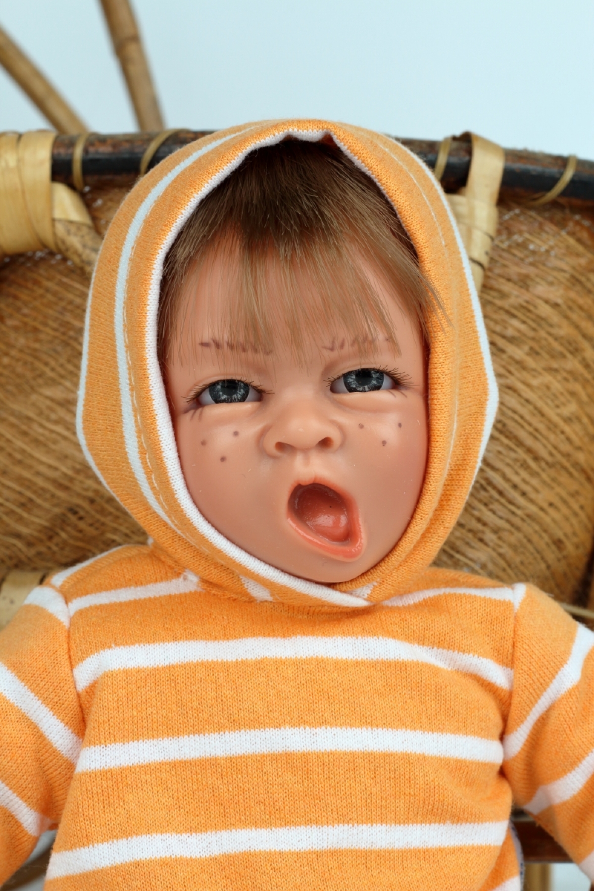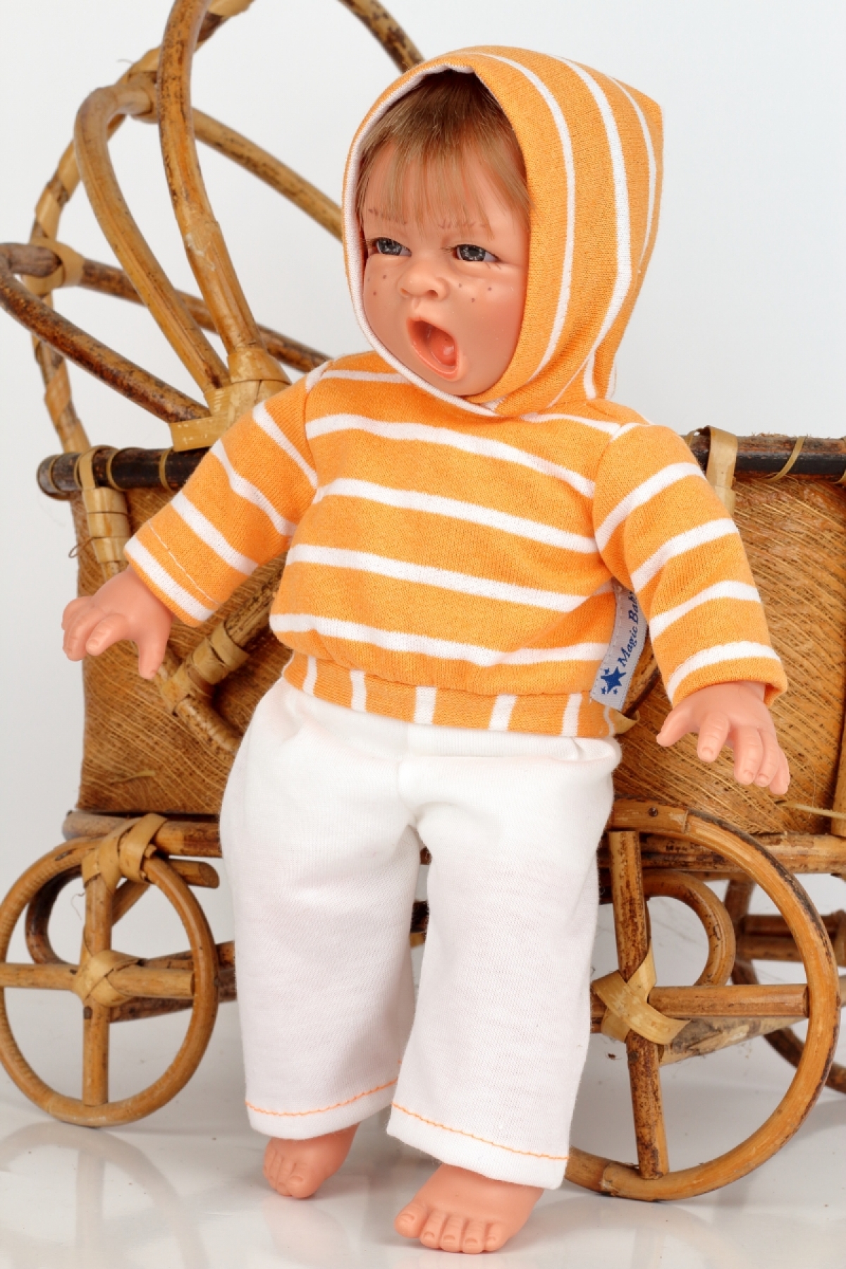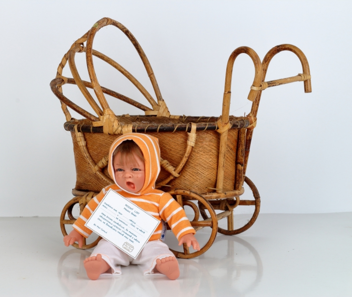 Realistická bábika má mikinu s kapucňou, nohavice a rodný list.