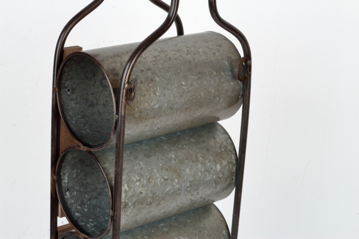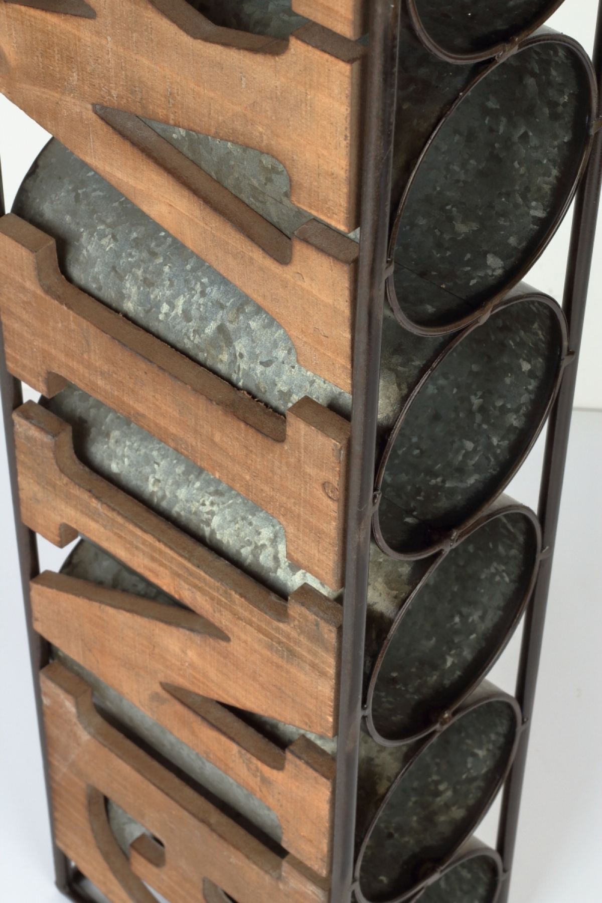 Materiál: kovová guľatina (unesie aj plné zaťaženie fľašami), pozinkovaný plech (futrál na fľaše), drevený ručne vyrobený nápis