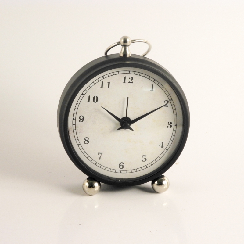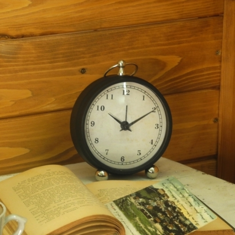 Retro budík s tmavým kovovým plášťom má priemer ciferníka 12 cm. Jeho celková výška je 17 cm a hĺbka 4 cm. Zreteľné číslice prečítate aj z väčšej diaľky.