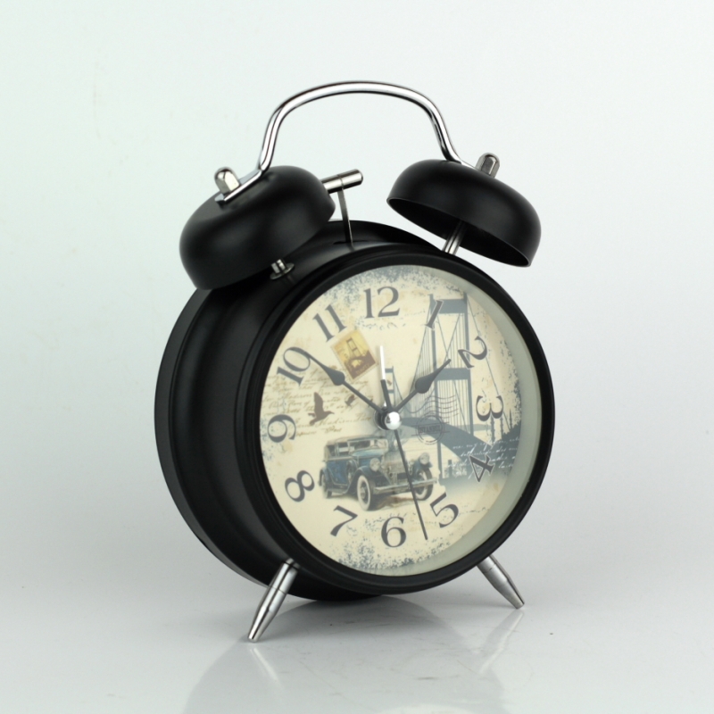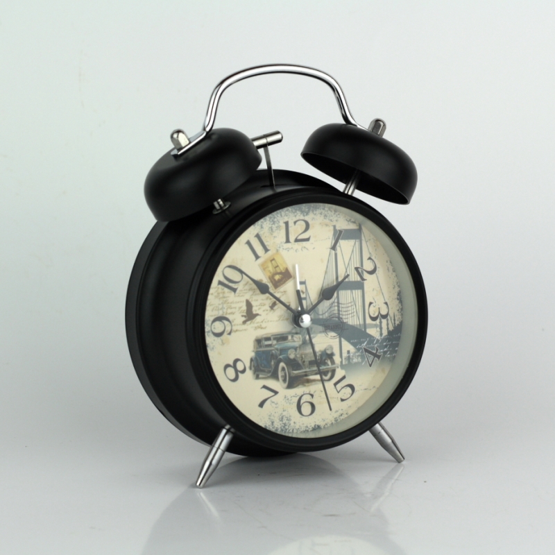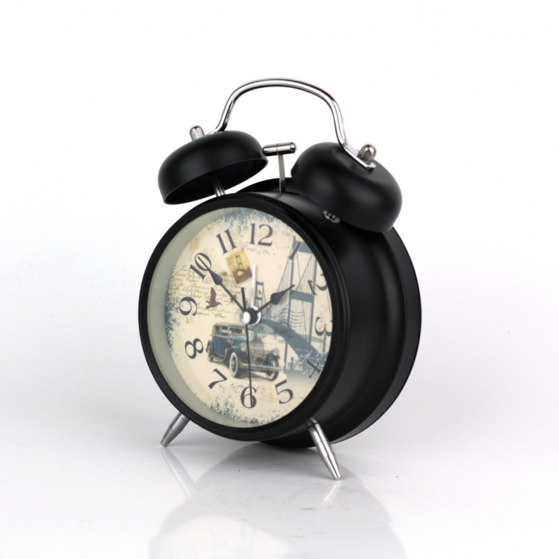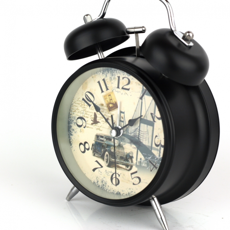 Krásny čierny budík s retro motívom a dobre čitateľnými číslicami.