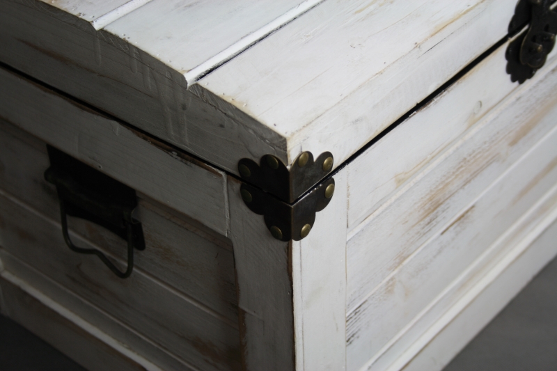 Kufor je zo svetlého dreva s patinou a má tmavé kovania. Kované rozetky pripomínajú tvar kvetov, ktorý celý kufor robí ešte zaujímavejším.