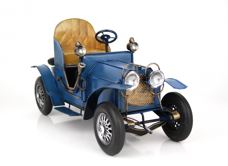 Retro model auta bez strechy v modrej farbe so zlatými detailmi.