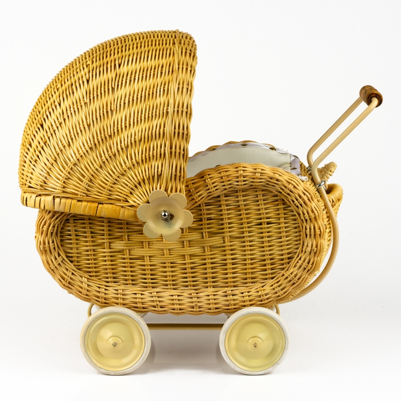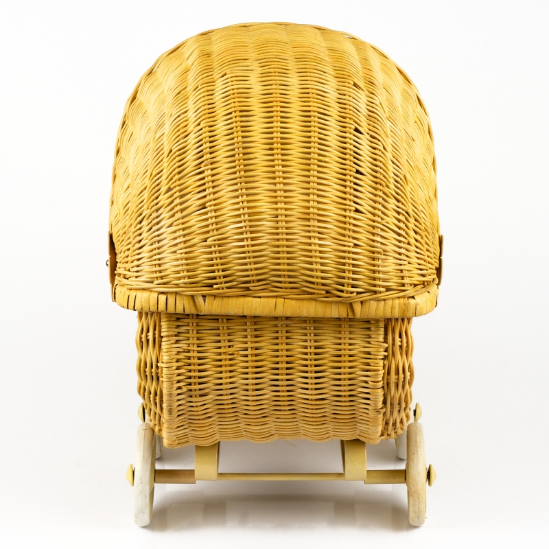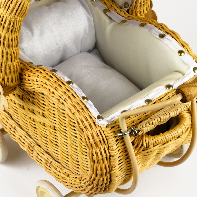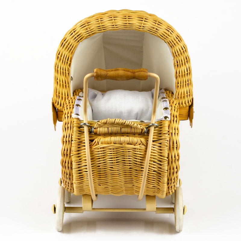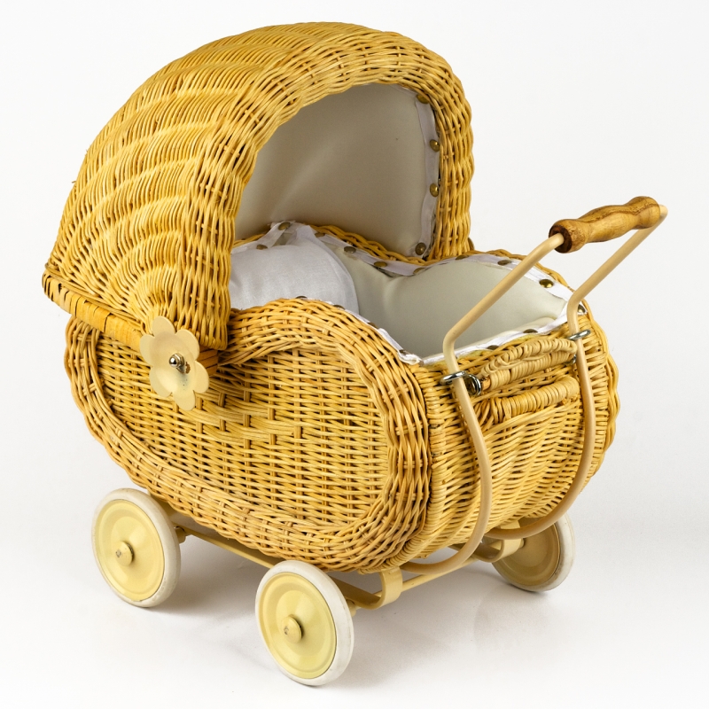Prekrásny retro doplnok k štýlovému nábytku. Tento kočík je vyrábaný ako replika retro používaného kočíka pre bábiky - ako starožitnosť. Strieška je vyrobená z prútia. Spodnú časť tvorí kovová konštrukcia kočíka.