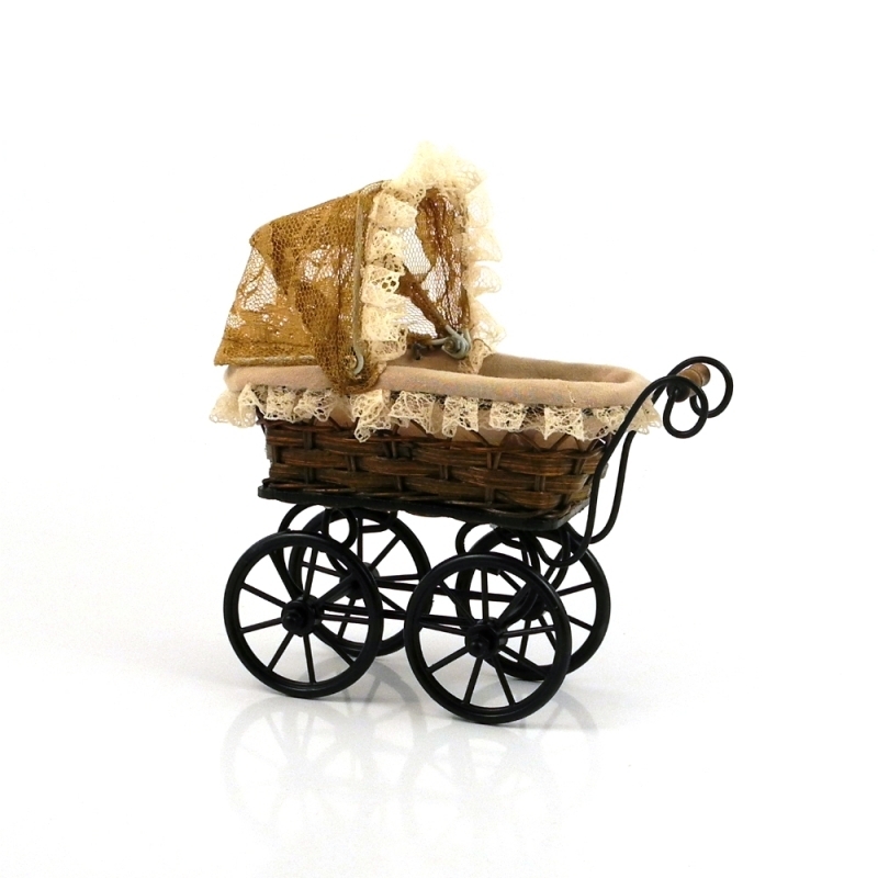 Retro kočárek proutěný. Rozměry 10cm šířka, 19cm celková délka a 17cm výška se sklopenou boudičkou. S vysunutou boudičkou cca 20cm. Materiál: kov, proutí, krajka