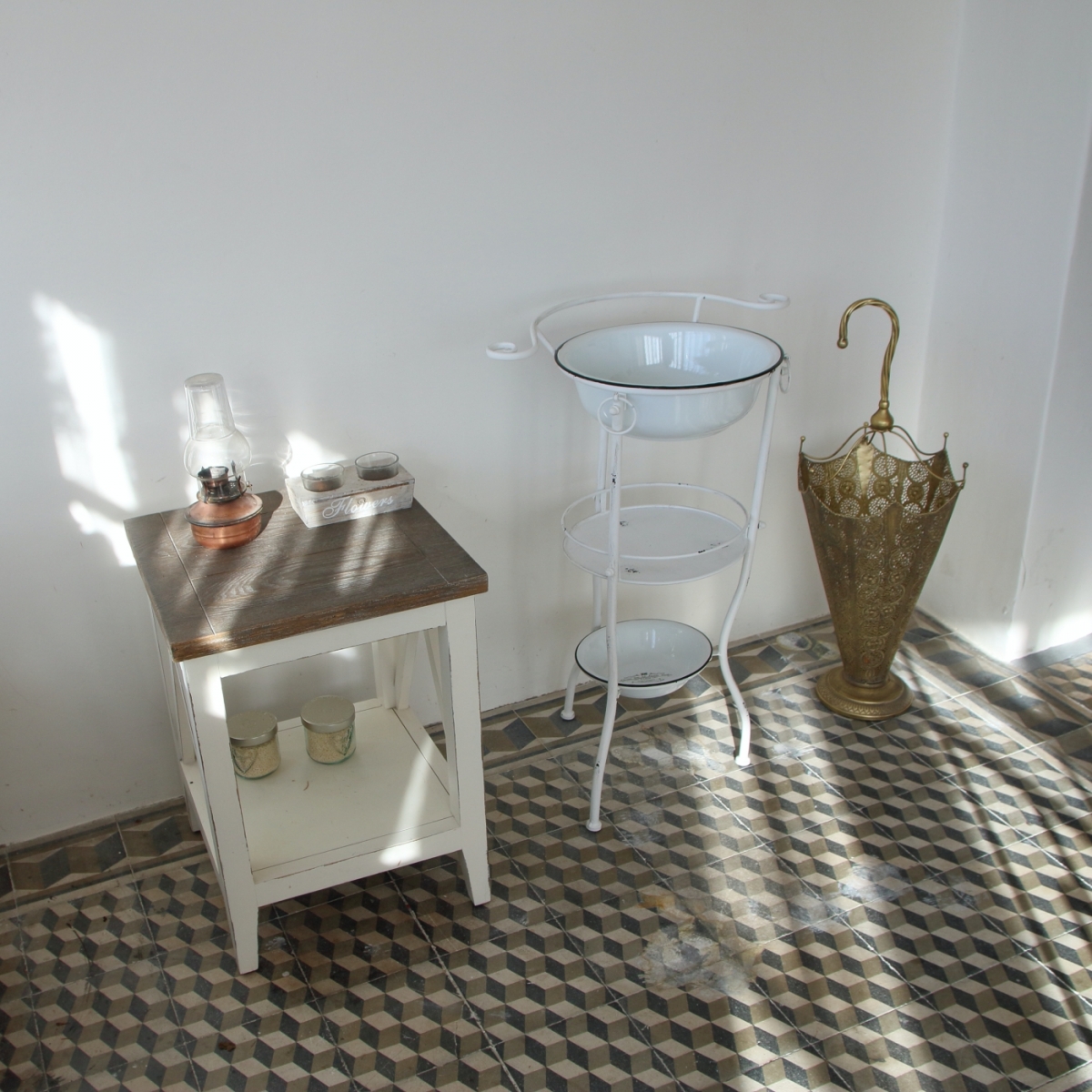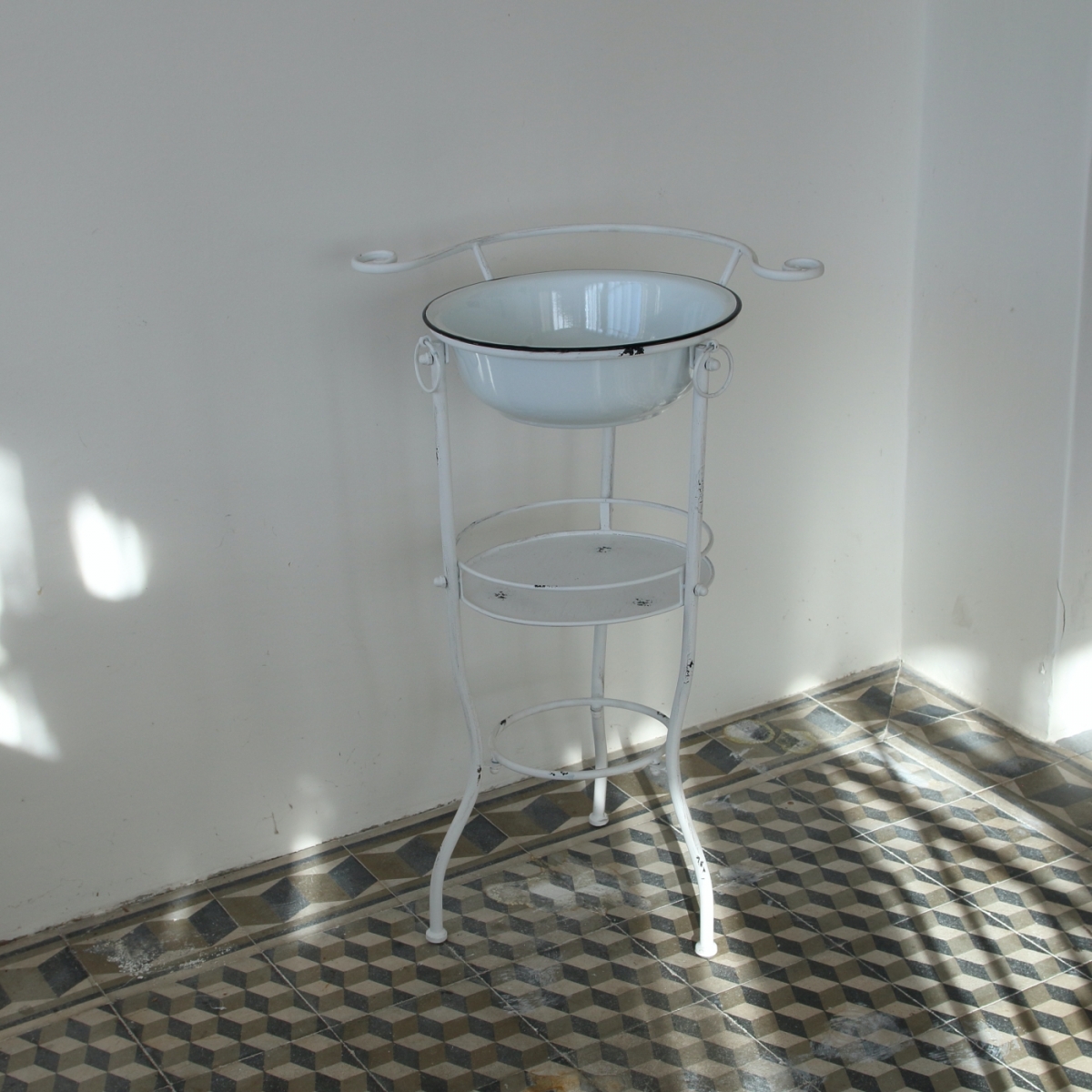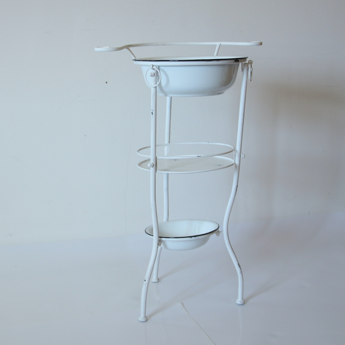 Retro stojan na umývadlo s poličkami na žinku, mydlo a holiace potreby, ktorého konštrukcia je vyrobená z kovu. Tento stojan je ideálny pre milovníkov vintage designu. Umývadlo je plechové, so smaltovaným povrchom, ktorý dodáva umývadlu jedinečný retro vzhľad.