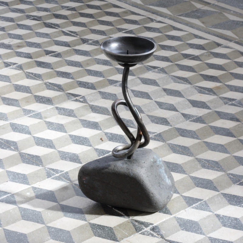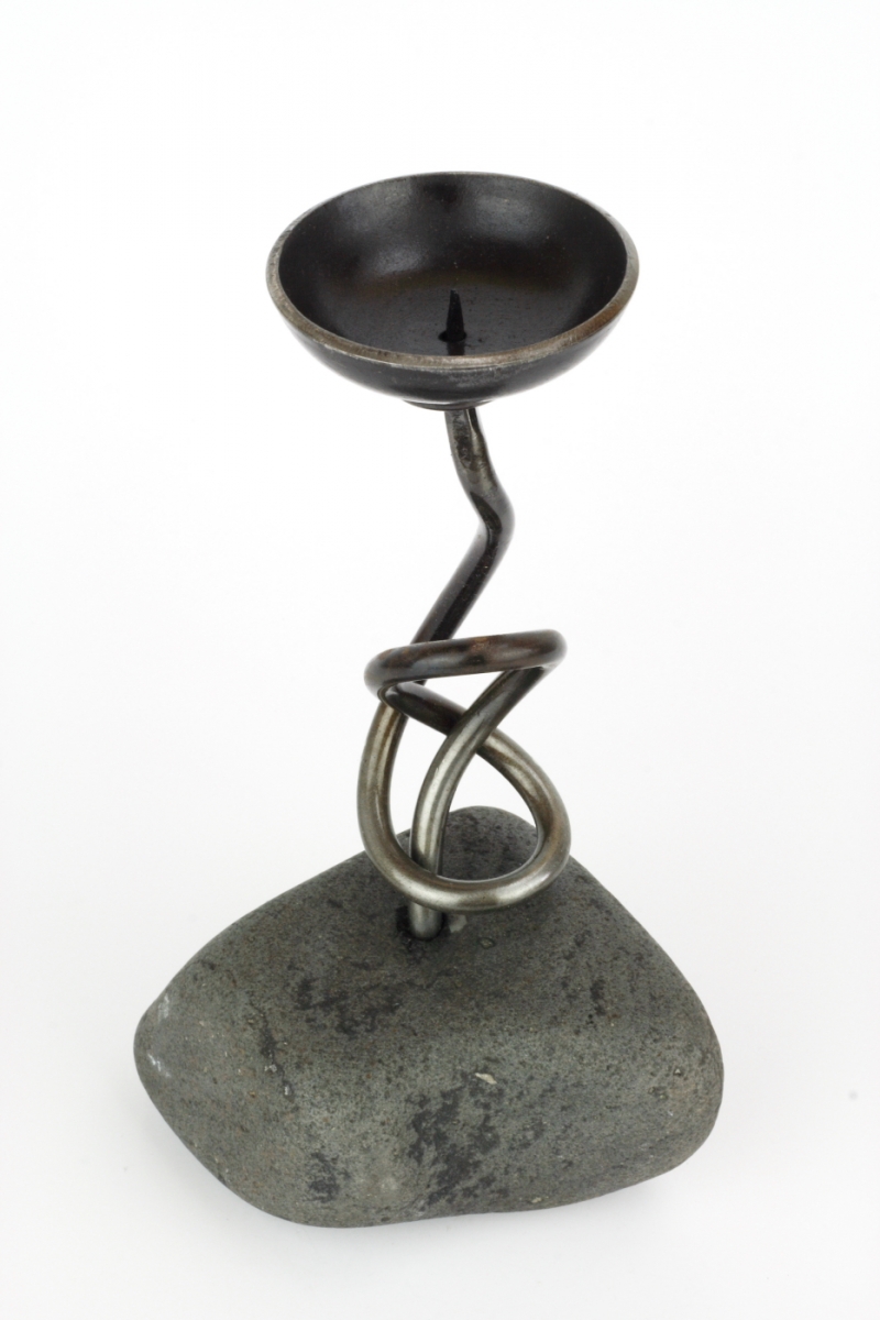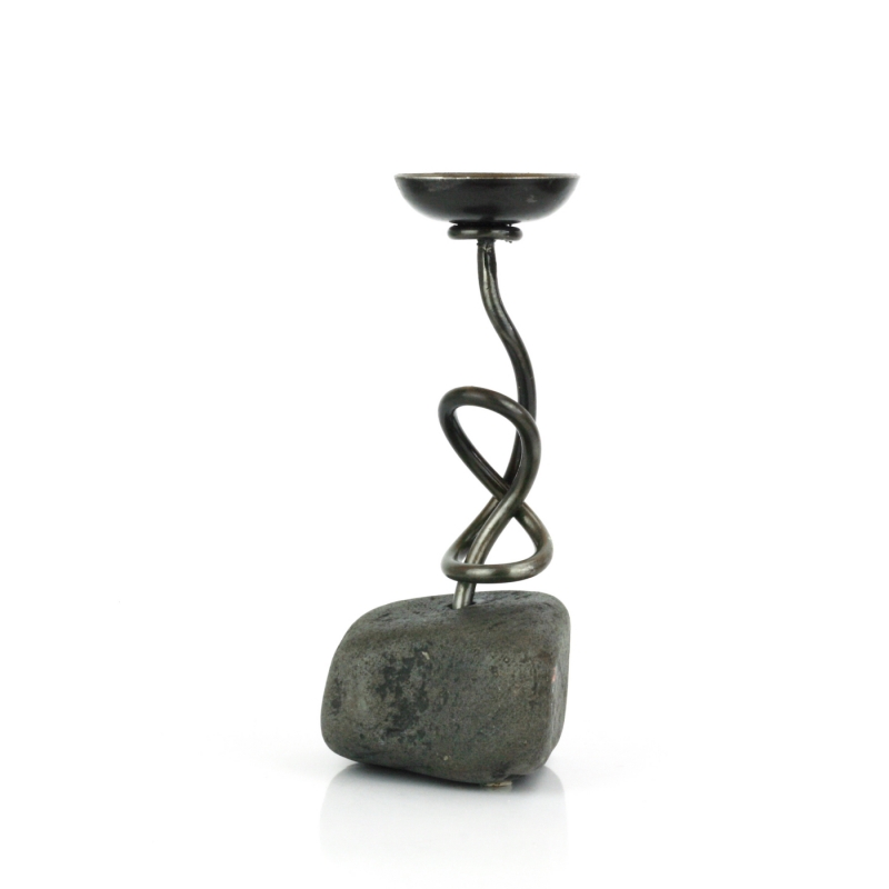 Ručne kovaný svietnik je zasadený do veľkého obliaka. Spodná časť kameňa je podlepená podložkami, takže sa nemusíte báť, že by kameň poškodil dosku stola alebo komody.
