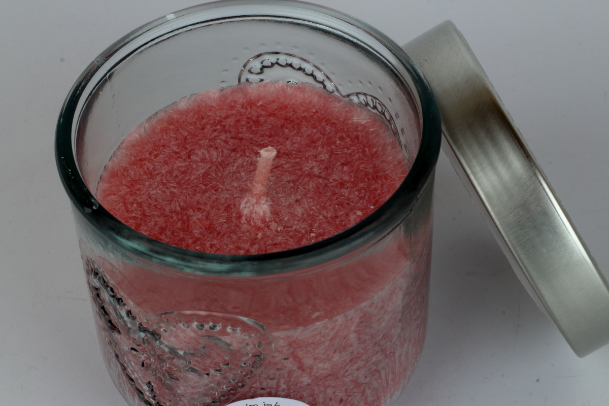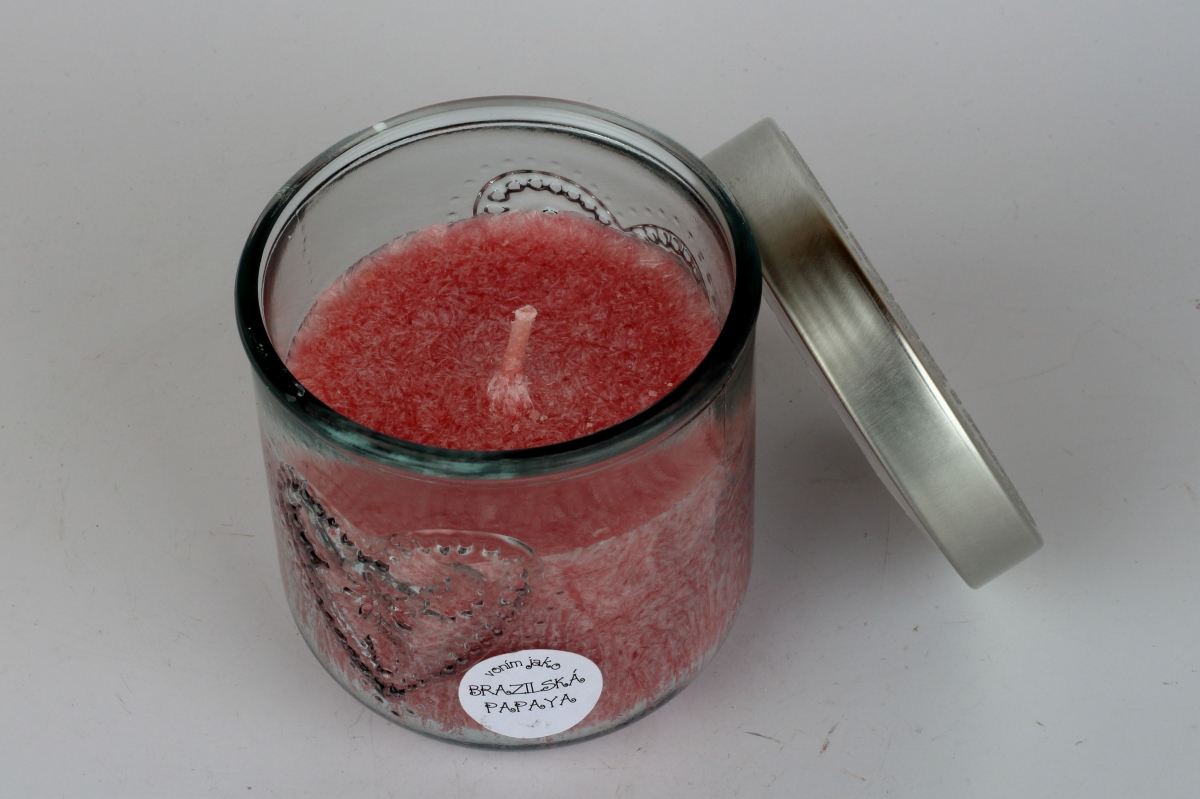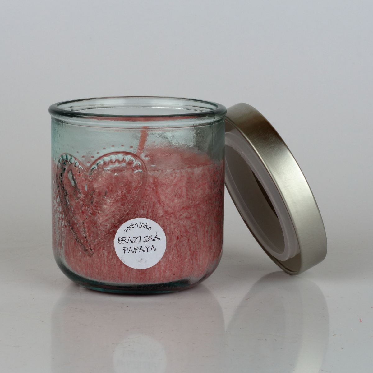Ručne odlievaná sviečka v sklenenej dóze so srdcom brazílska papaya 190g