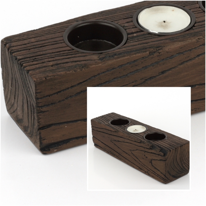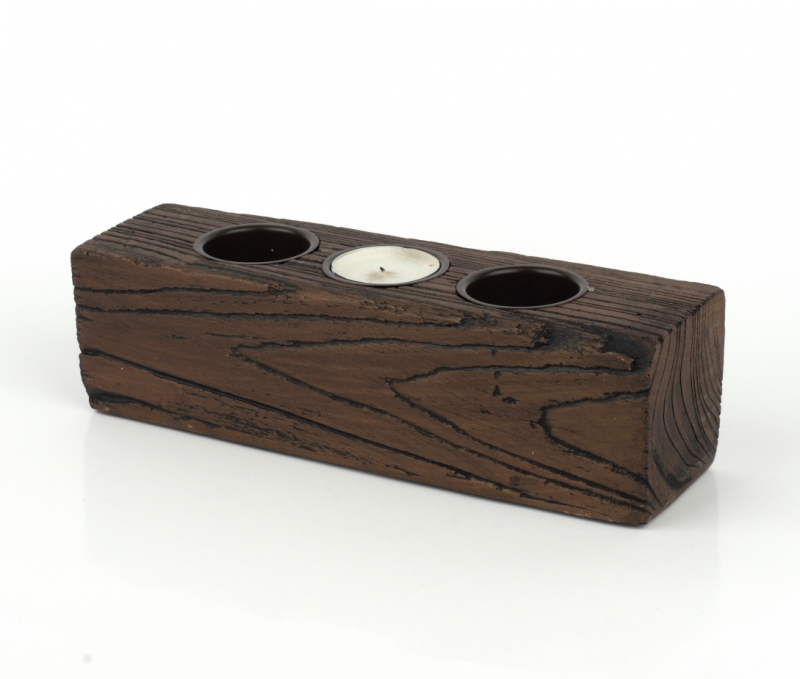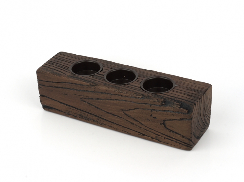 Rustikálne svietnik na 3 čajové sviečky 24x6x7cm zaujme predovšetkým milovníkov rustikálneho příodního vzhľadu. Ikdyž sa jedná iba o imitáciu dreva, ide o veľmi vierohodné prevedení. V malom trámu sú otvory na tri čajové sviečky. Výrzaná kresba dreva a tmavá farba krásne vynikne na svetlej komode alebo stole.