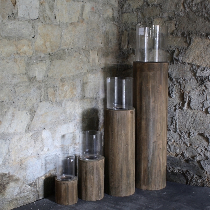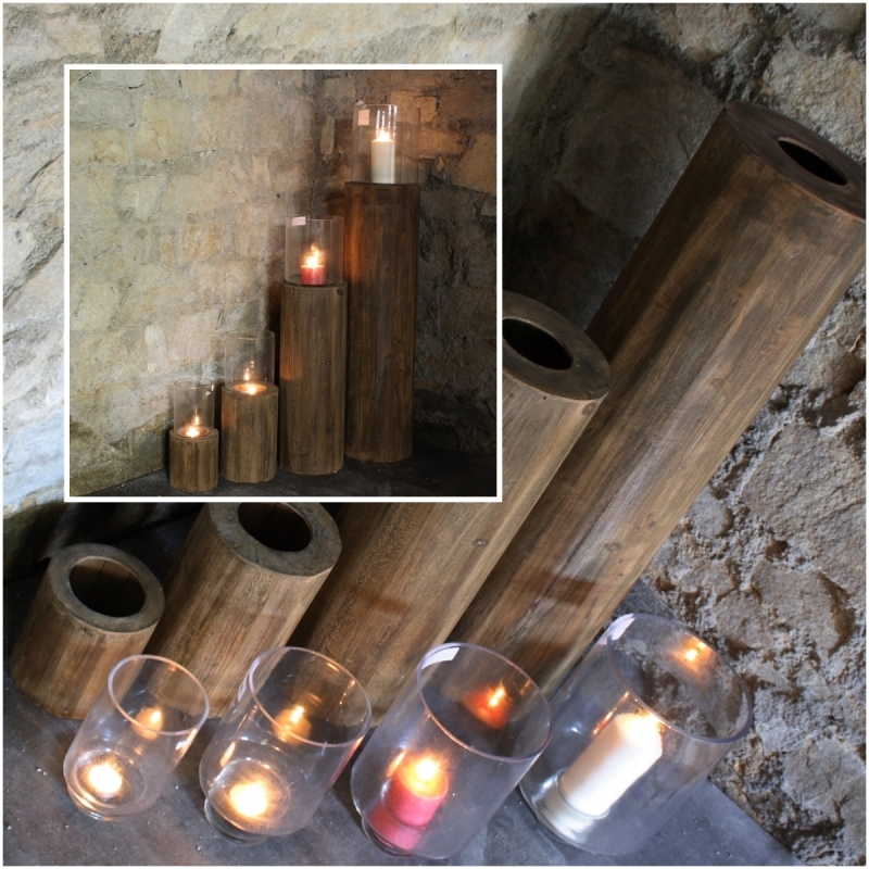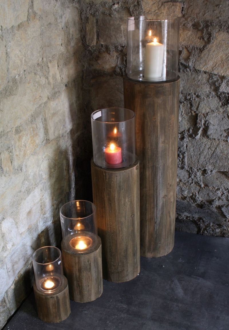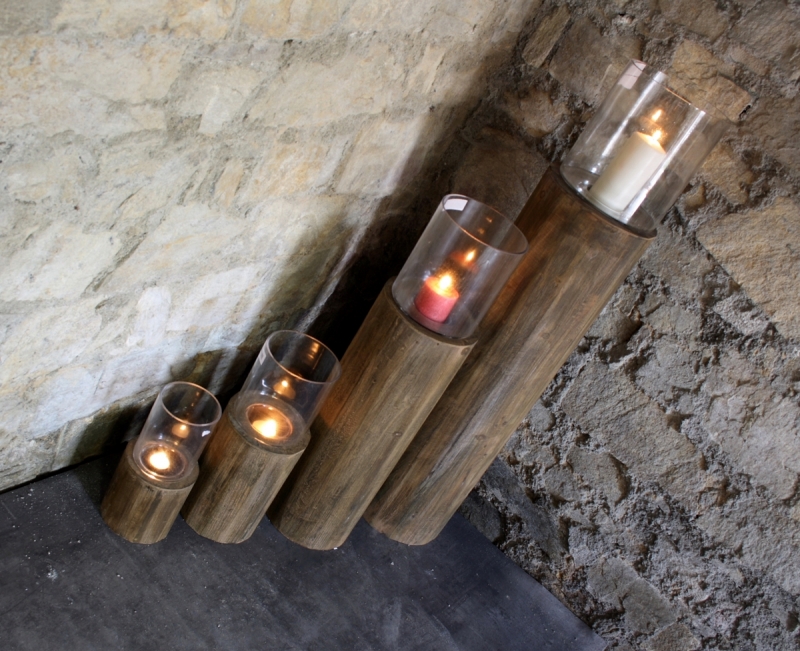 Sada 4 drevených svietnikov klát 31/45/81/115cm vnesú kus prírody do vašej obývačky, alebo rozžiari terasu na záhrade. Svietniky pripomínajúce kláty dreva majú v hornej časti otvory na sviečky a sklenený kryt (vďaka nemu môžete svietniky bez obáv umiestniť aj v exteriéri).