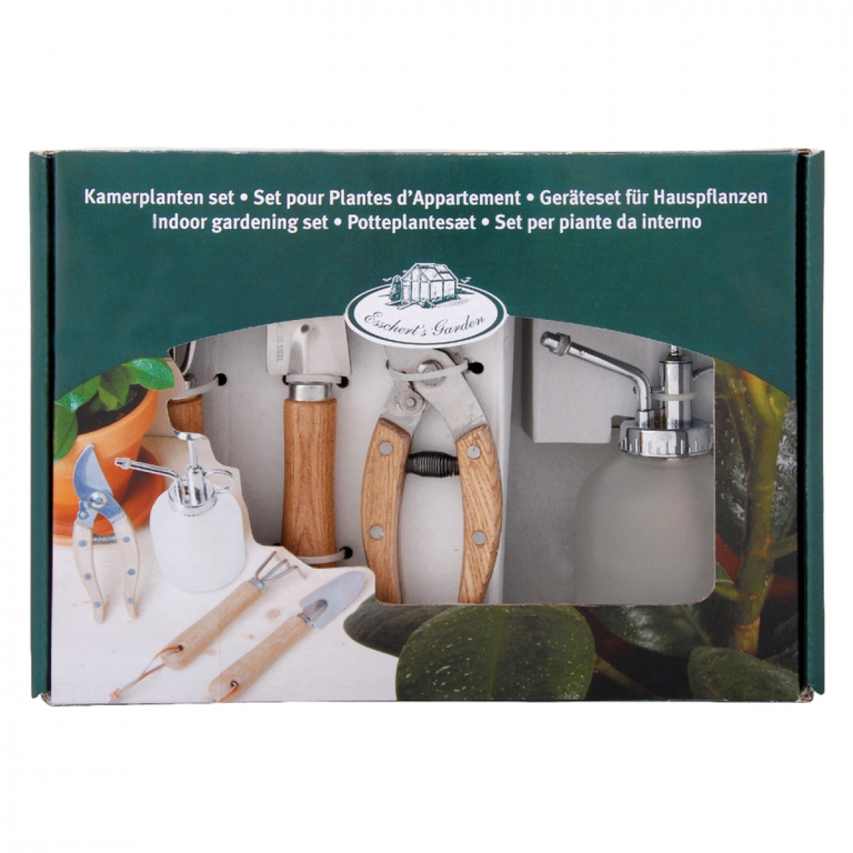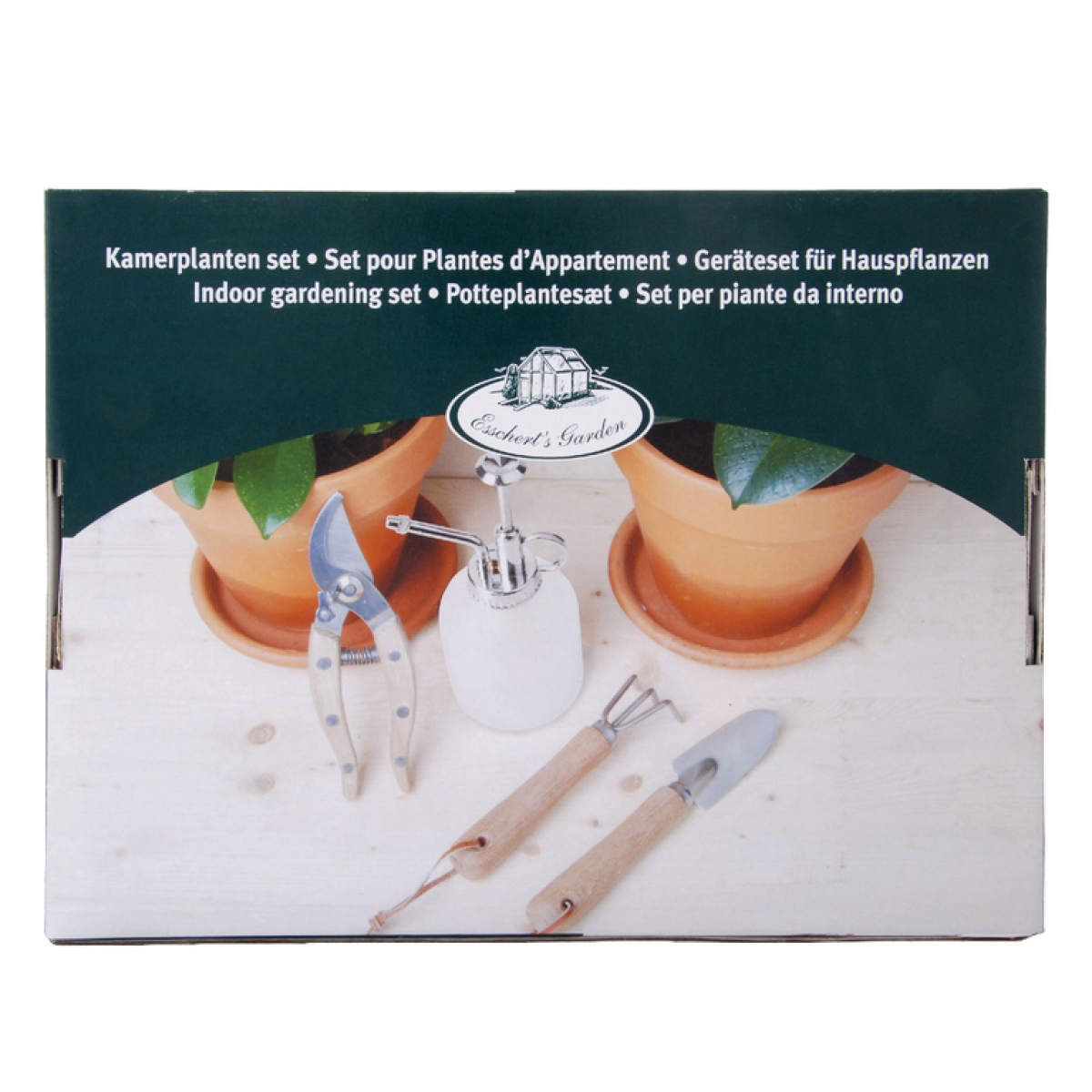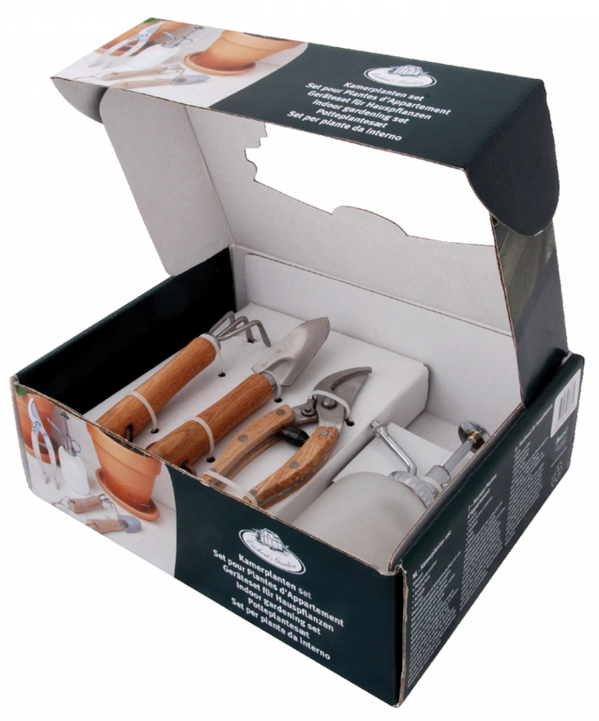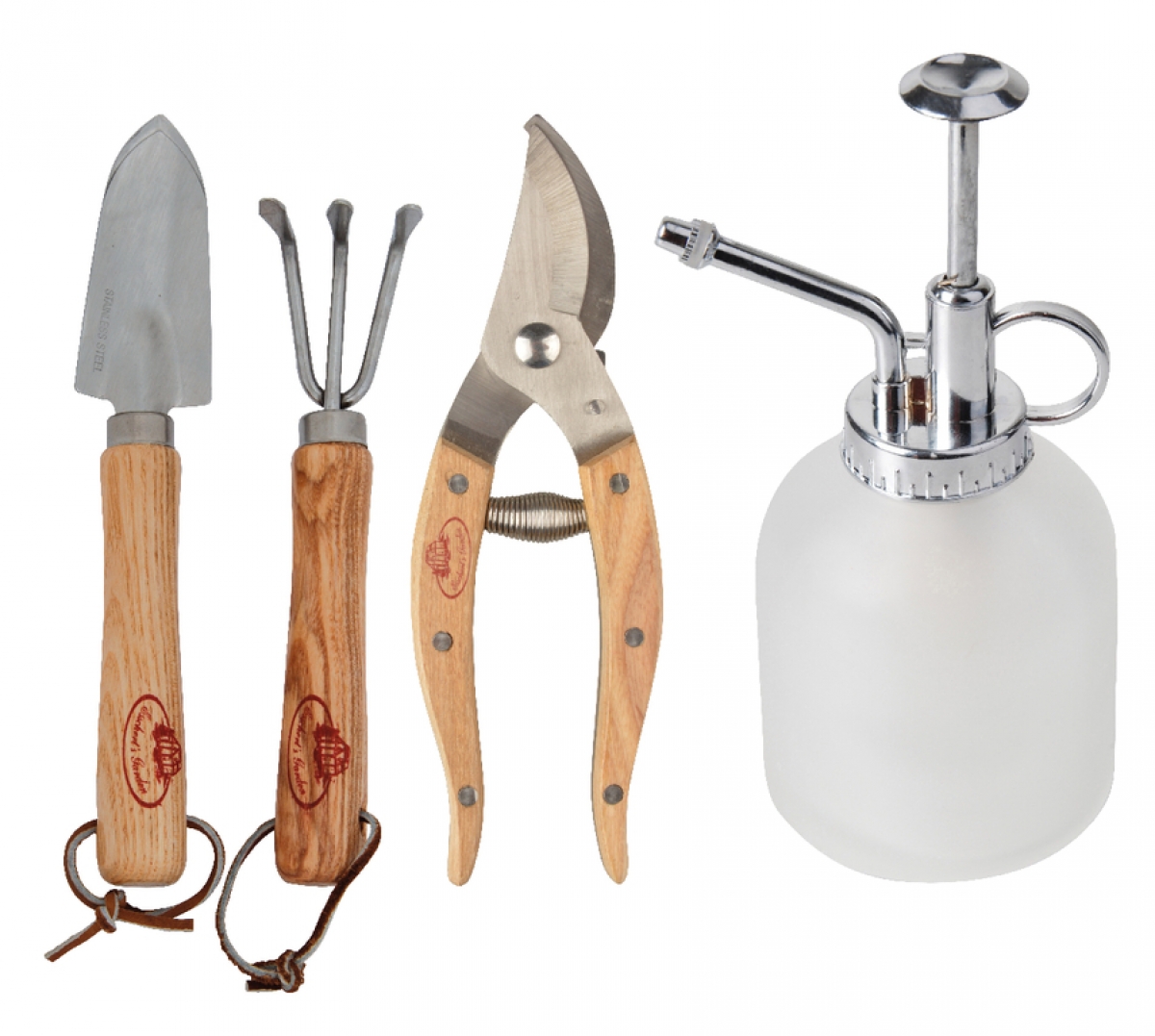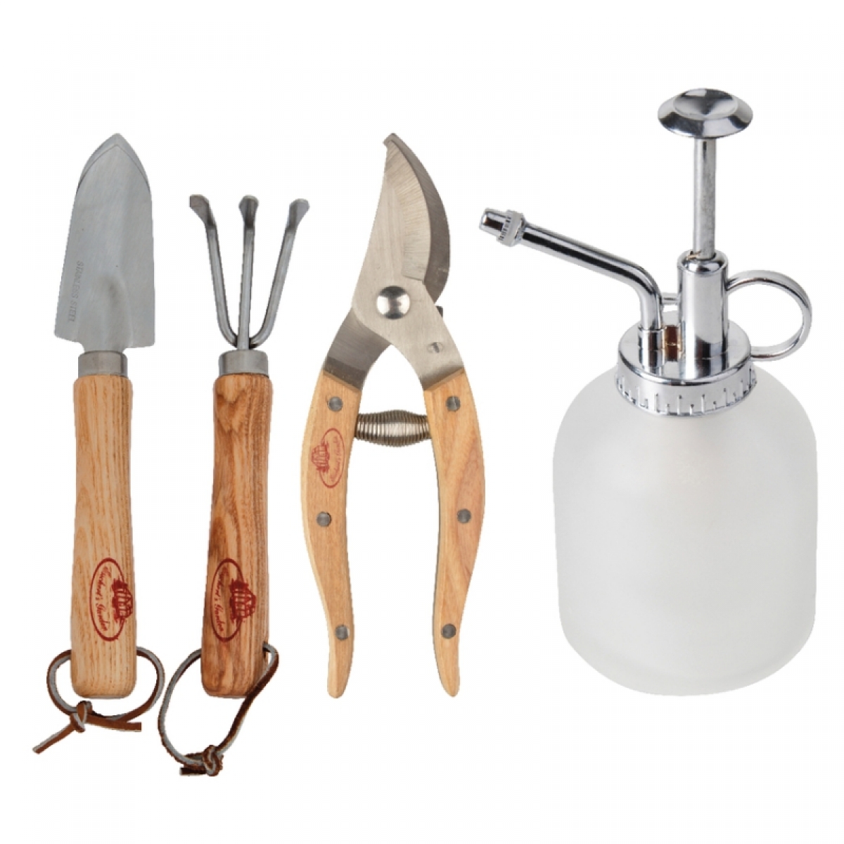 Sada ručného náradia obsahuje 1 x oceľový ručný rýľ s drevenou rukoväťou, 1 x ručné hrabličky sa 3-mi hrotmi, 1 x sklenený postrekovač rastlín, 1 x darčekový box.